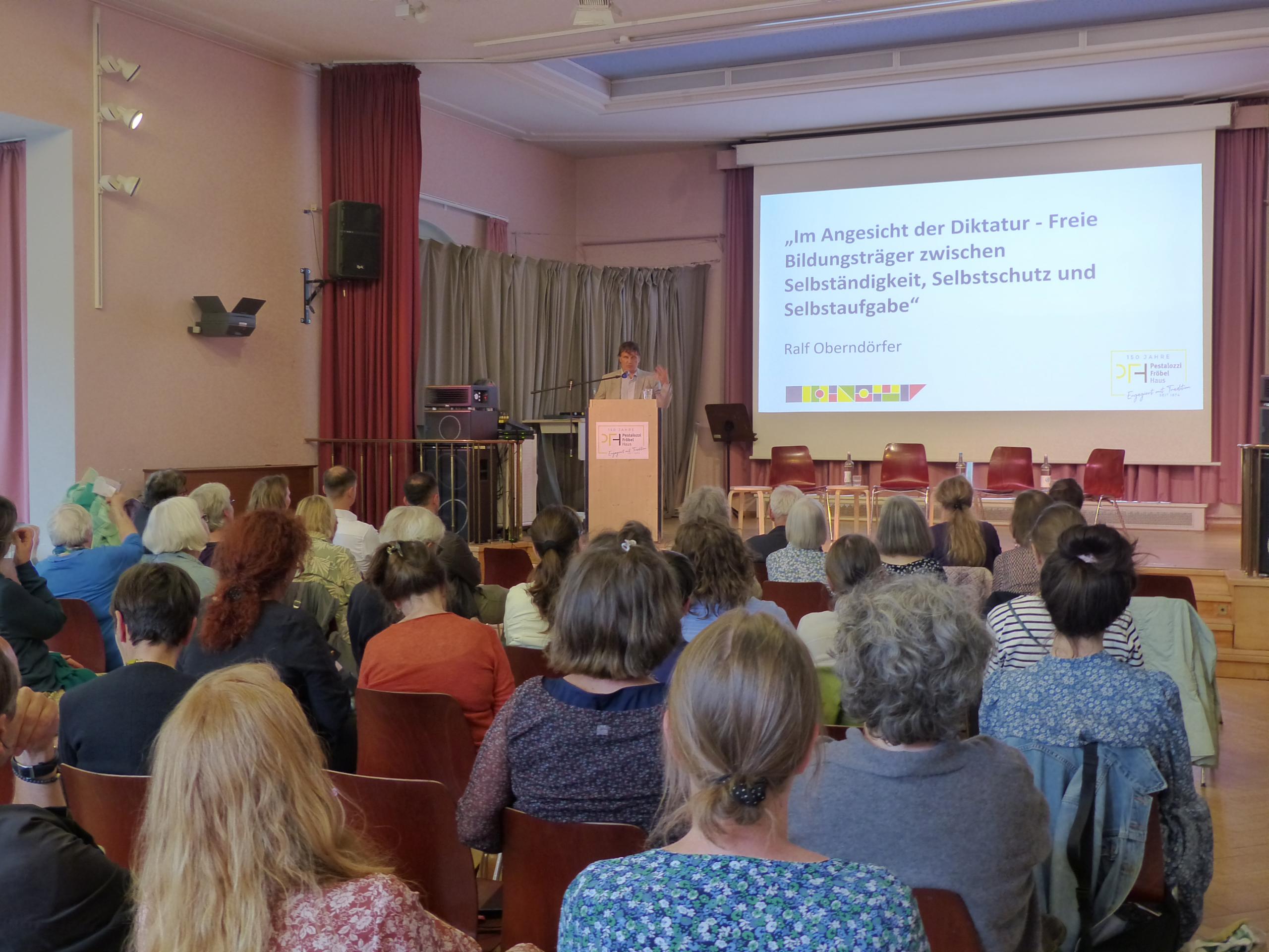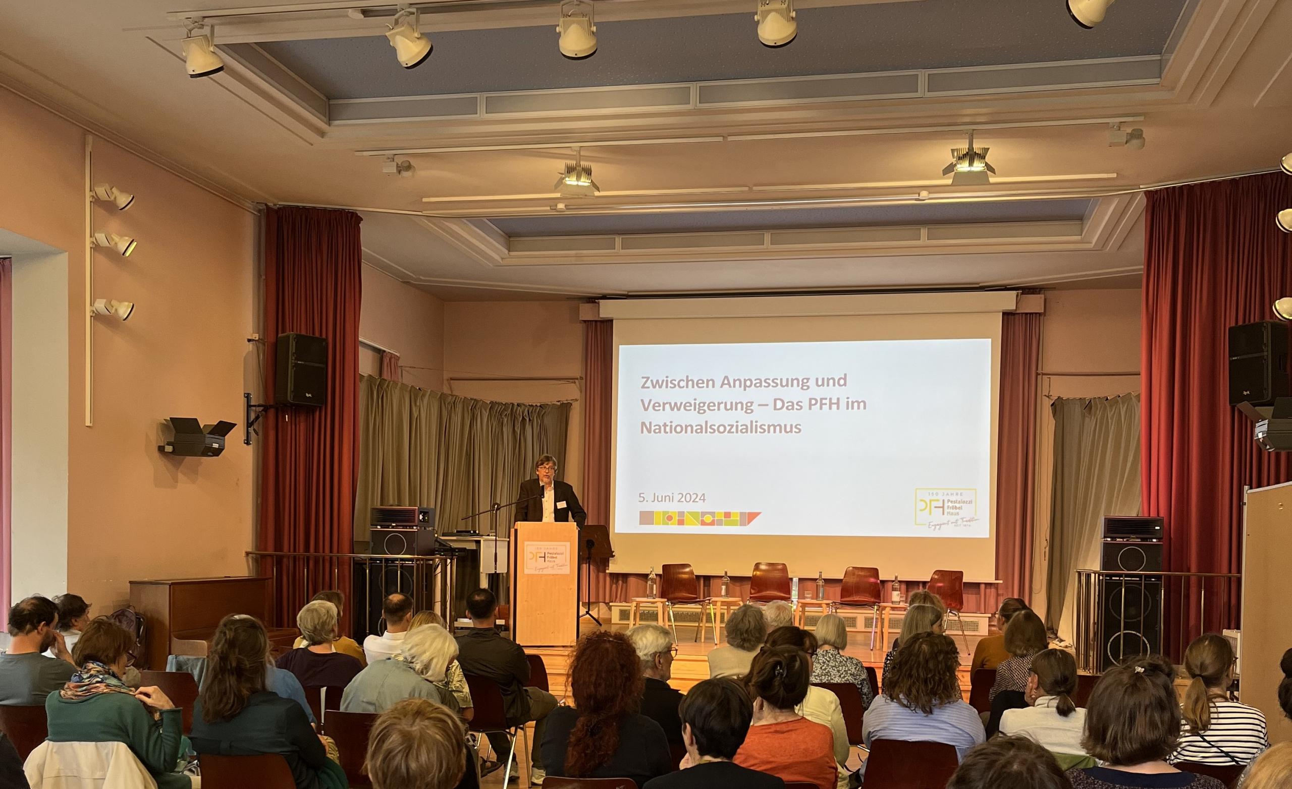 Nach der Begrüßung von PFH-Direktor Prof. Ludger Pesch gab Historiker Ralf Oberndörfer einen Einblick in die Rahmenbedingungen der Berliner Bildungslandschaft (Schwerpunkt Kindergärten) zur damaligen Zeit und analysierte Reaktionen von Verwaltung und Trägern auf die neuen Vorgaben nach 1933. Dabei nannte er Beispiele für das unterschiedliche Verhalten einzelner Entscheidungsträger*innen, um deutlich zu machen wie Handlungsspielräume auf verschiedene Weise genutzt werden konnten. Er ordnete sie fünf Kategorien zu: „sich dumm stellen“, „eigene Regeln entwickeln“, „Dienst nach Vorschrift“, „Eifer“ und „freie Radikalisierung“.