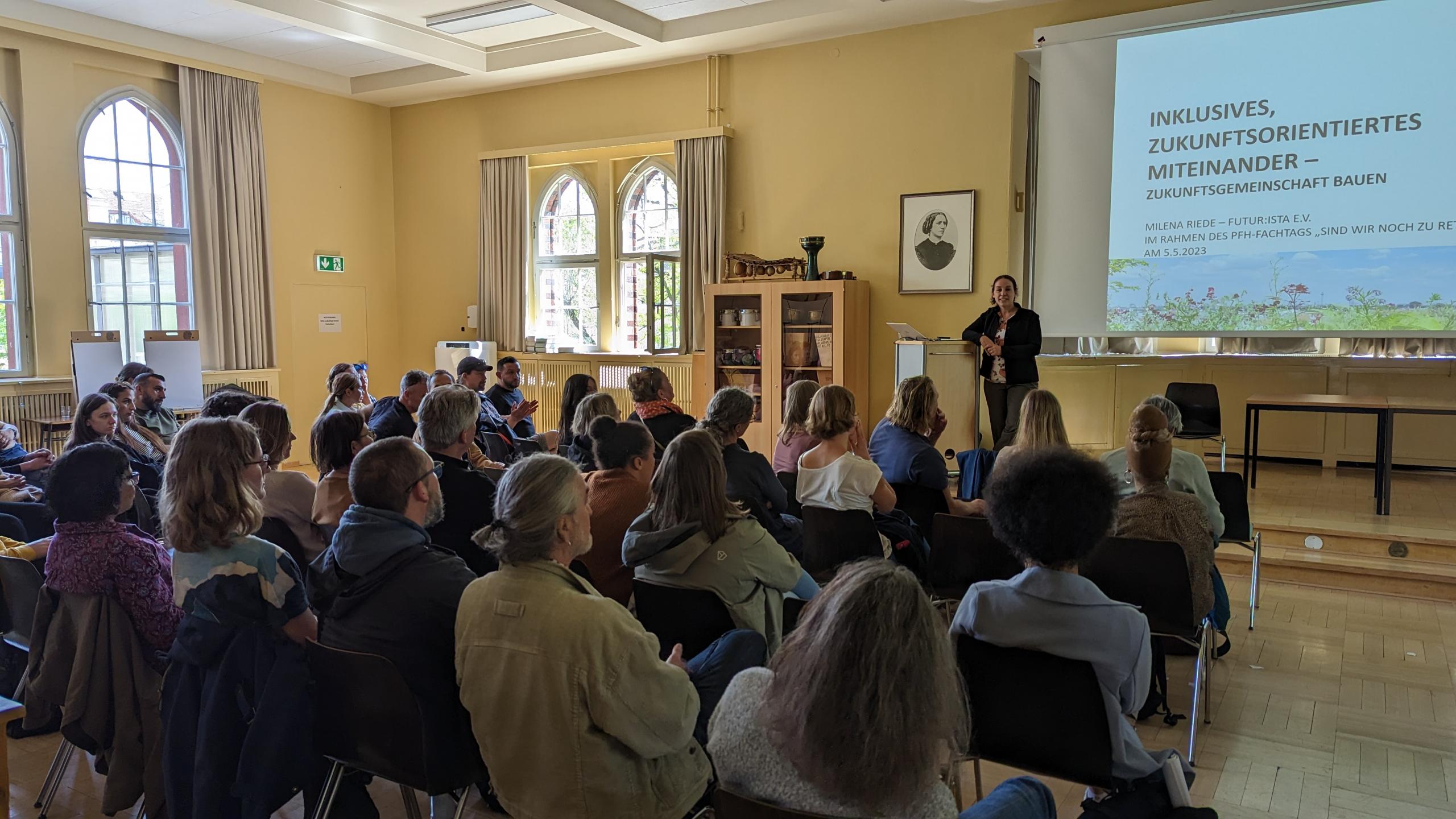 Was bedeuten die Ziele für unsere tägliche Arbeit? Welche Projekte wollen wir angehen? Mit Workshops, Vorträgen des Futur:ista e.V. und in Arbeitsgruppen haben wir uns diesen Fragen angenommen. Die Themen reichten von veganer Ernährung über Papier schöpfen bis hin zum Austausch mit Klimaaktivist*innen, von Zukunftsvisionen einer grünen Stadtplanung bis hin zu Bildung für nachhaltige Entwicklung. Für die PFH-Mitarbeiter*innen war es zum einen ein Tag der Weiterbildung und Inspiration, aber auch ein Tag, um alte und neue Kolleg*innen besser kennenzulernen, interessante Gespräche zu führen und es einfach schön zu haben.