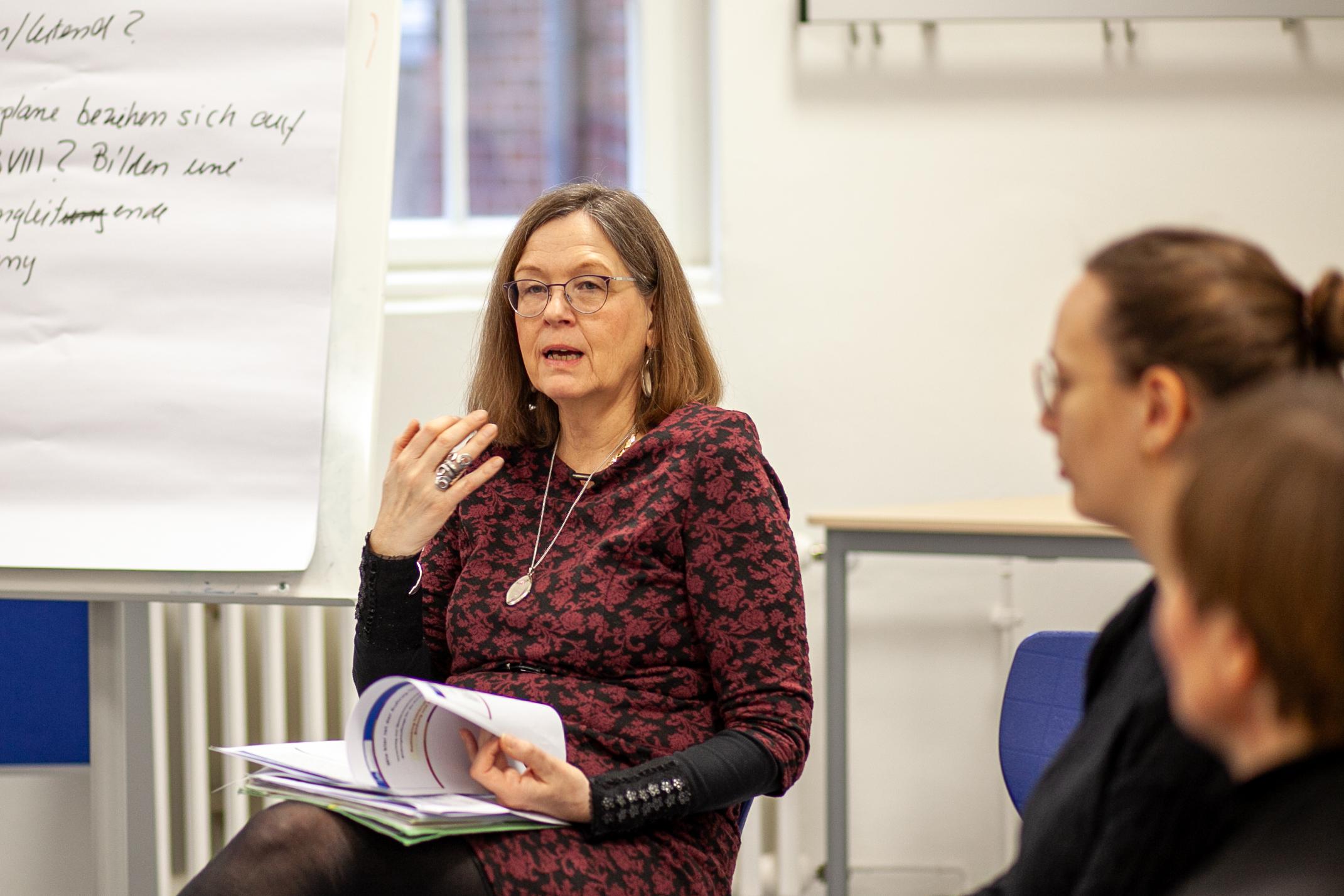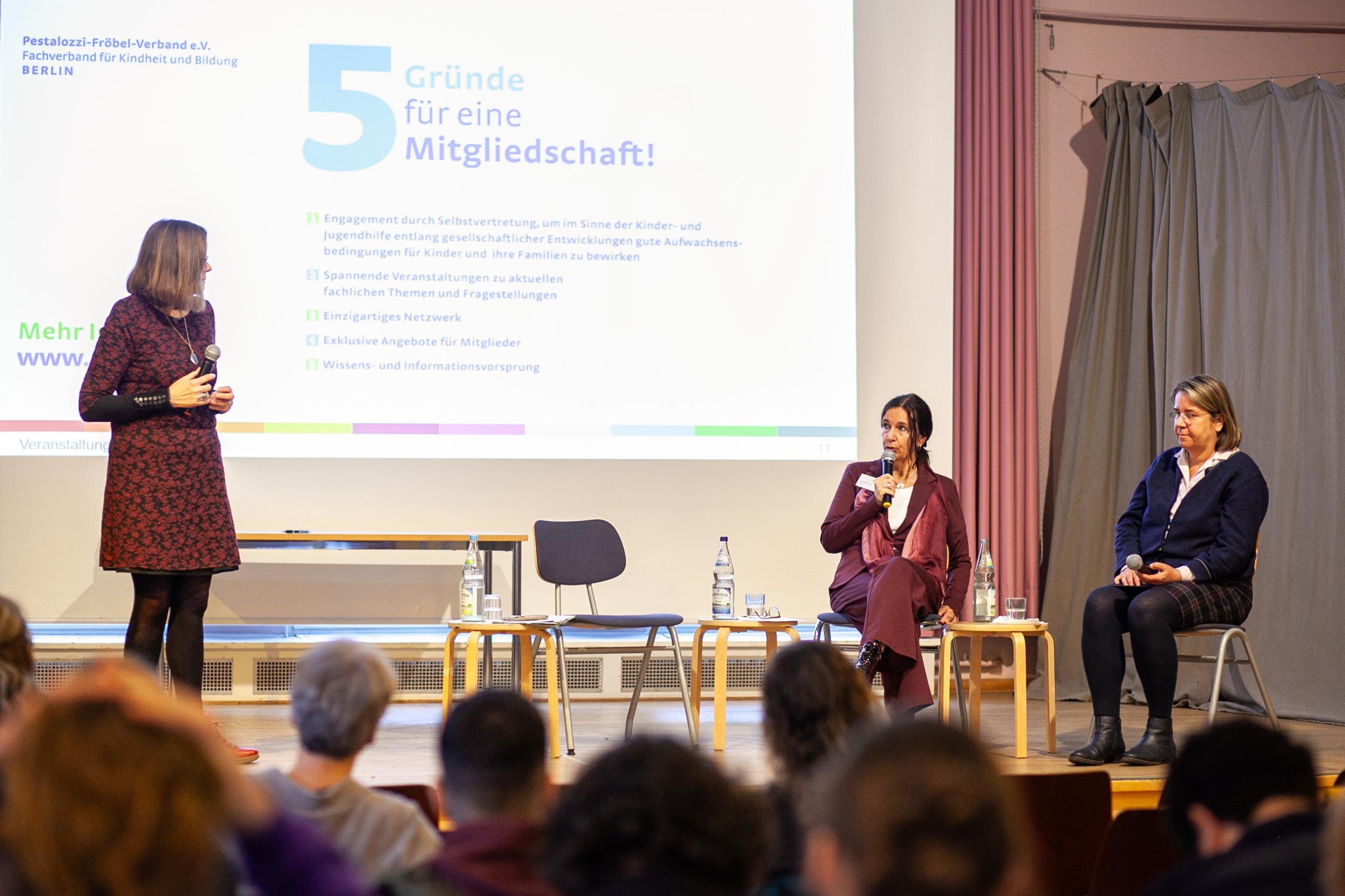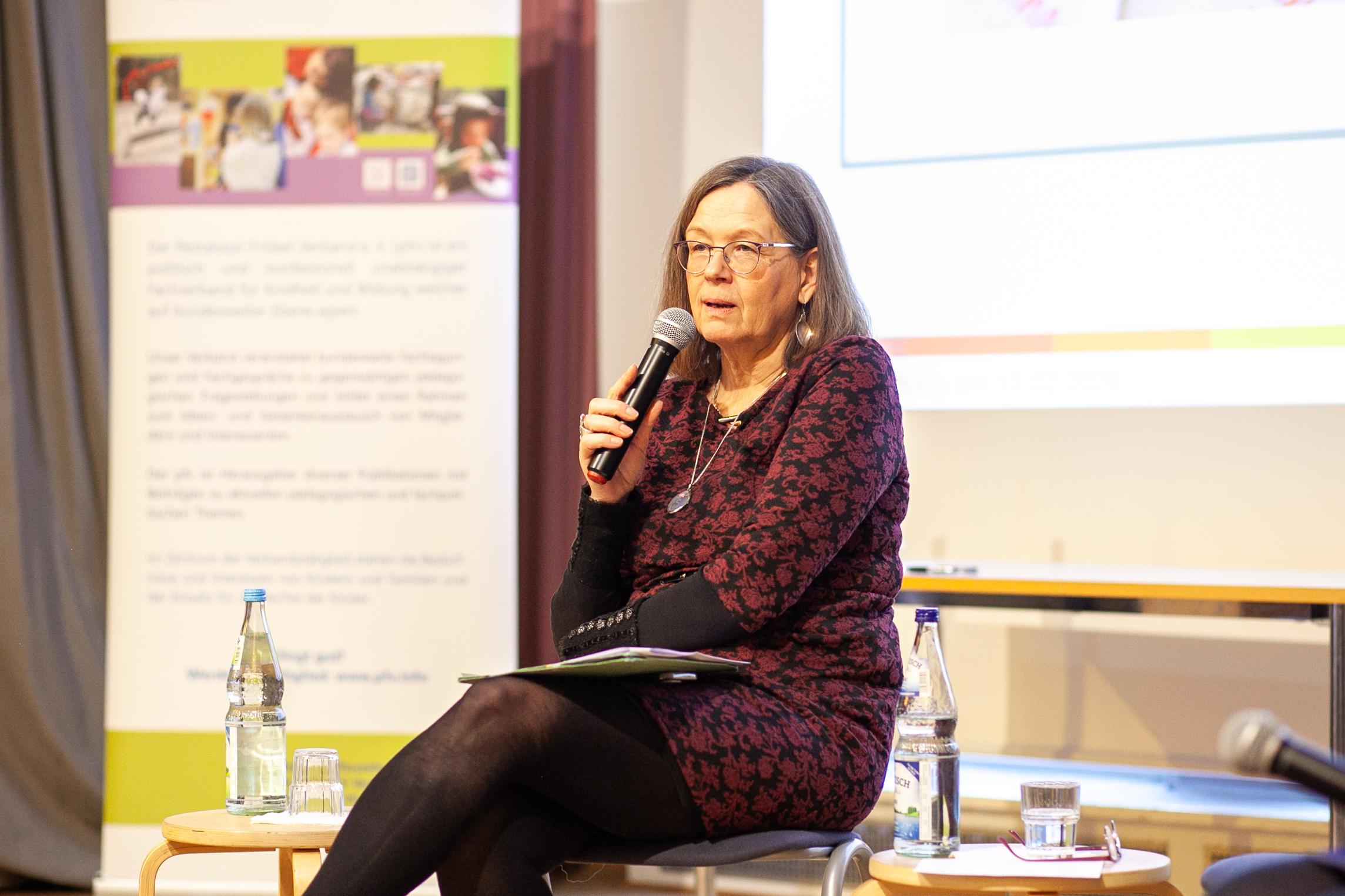 Die Leiterin der Bundesgeschäftsstelle des pfv Bettina Stobbe erläuterte die Genese, die Bedeutung und den Wortlaut des Vorschlags. Basierend auf Expertisen der frühpädagogischen Fachpraxis und erziehungswissenschaftlicher Forschung zur Trias Erziehung–Bildung–Betreuung schlägt der pfv eine kindorientierte Neufassung vor: