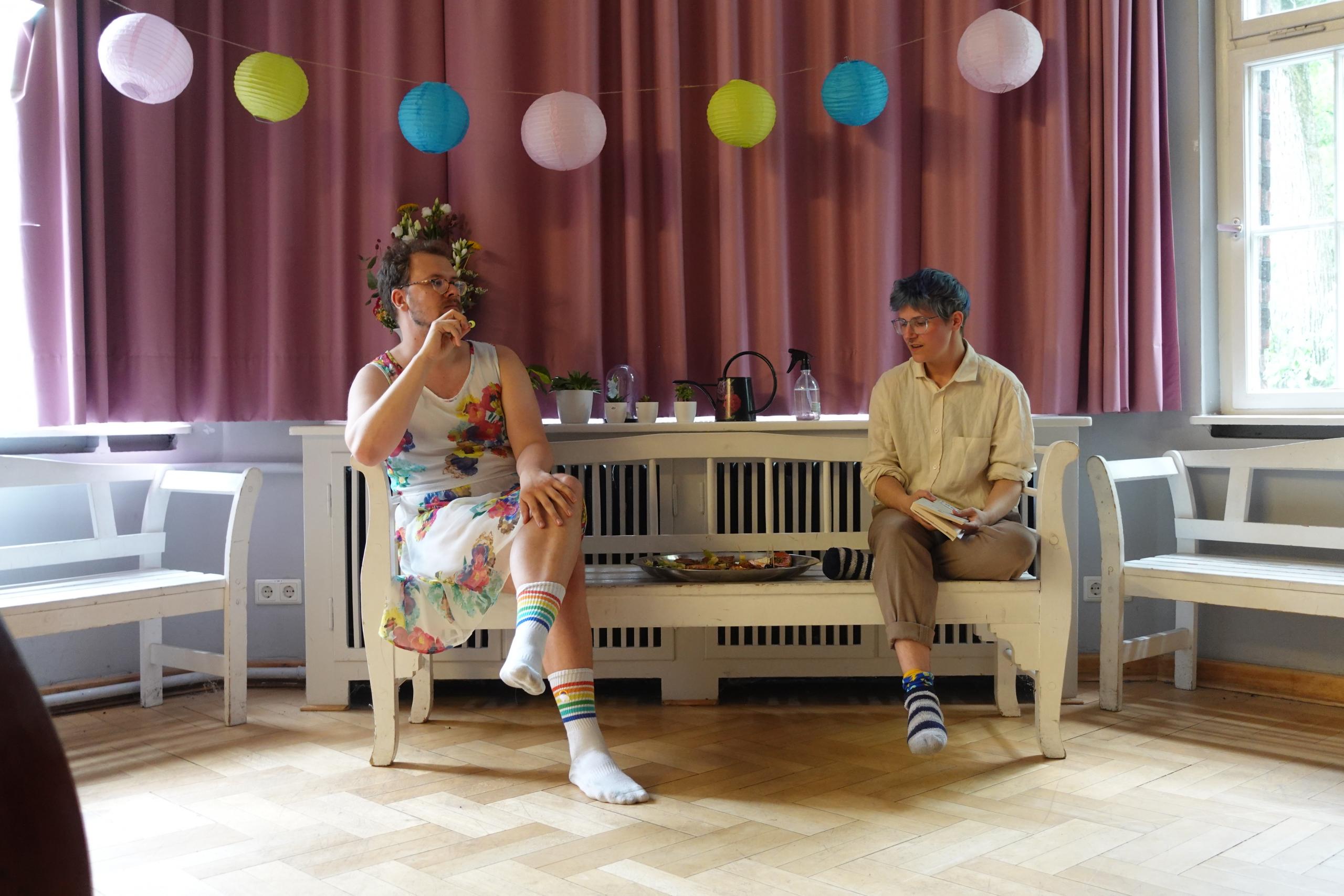 Trost und Unterstützung findet Hamlet bei Pheli (Ophelia dieser Fassung, gespielt von Juan Weigel) und in einer queeren Jugendhilfeeinrichtung. Die dort erfahrene Solidarität und der Rückhalt stehen in starkem Kontrast zur Ablehnung außerhalb dieser sicheren Räume. Die Inszenierung macht deutlich, wie wichtig Unterstützungssysteme für queere Jugendliche sind.