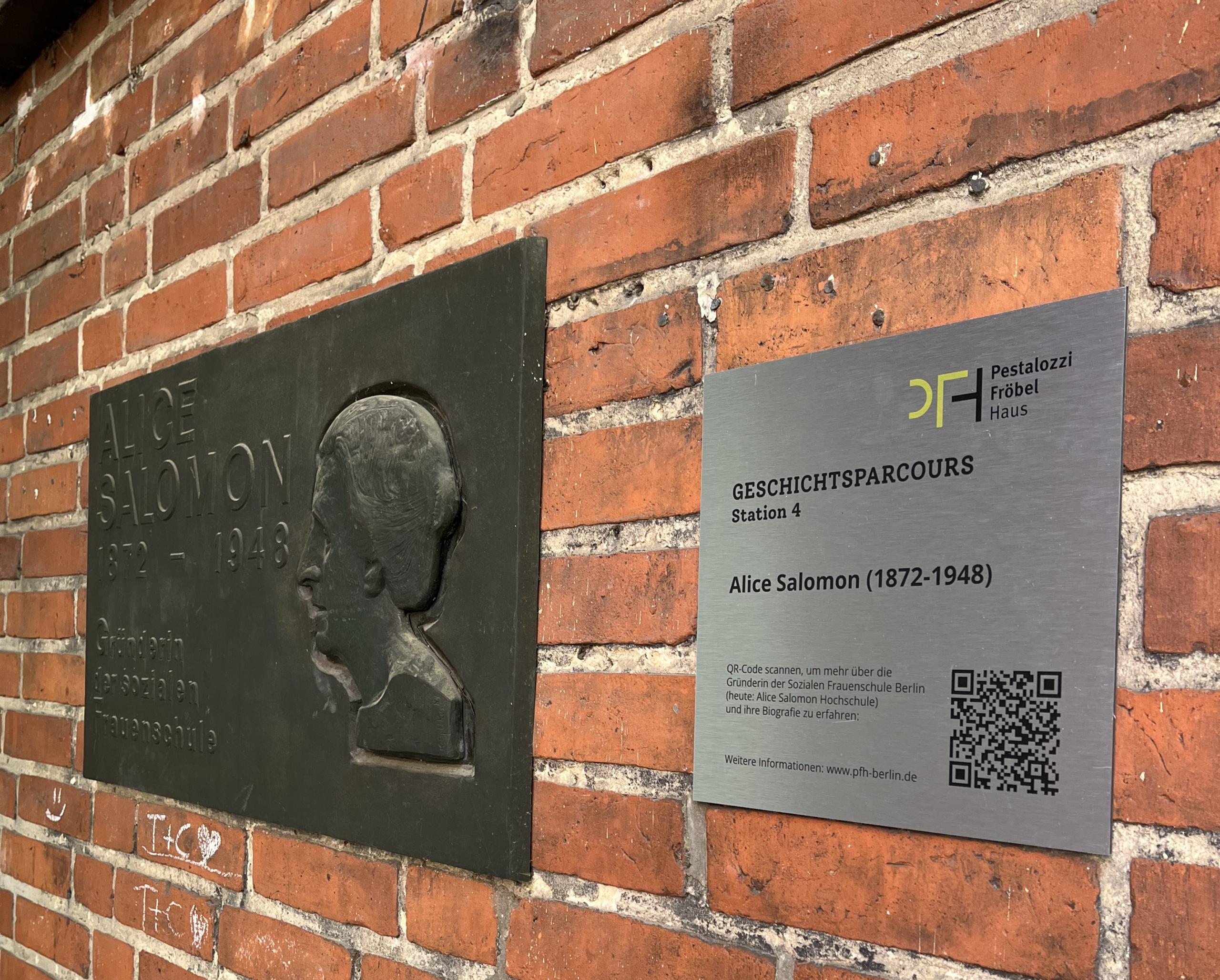 - Der Eingang zu Haus 3 gibt einen Hinweis zu Alice Salomon, der Gründerin der „Sozialen Frauenschule“ und einer der bedeutendsten Sozialreformerinnen des 20. Jahrhunderts. Weitere Informationen: https://www.pfh-berlin.de/de/artikelseite/alice-salomon-1872-1948