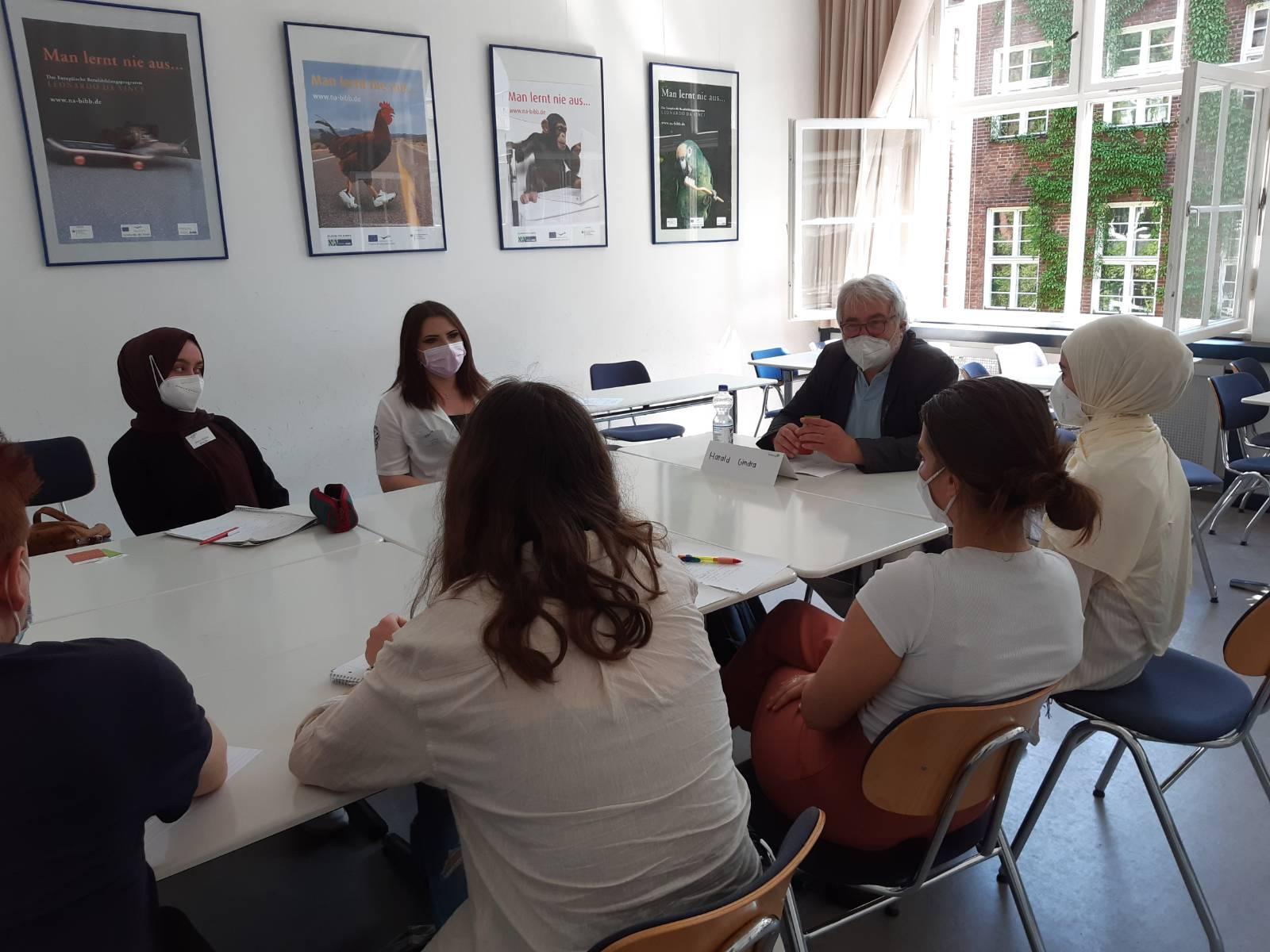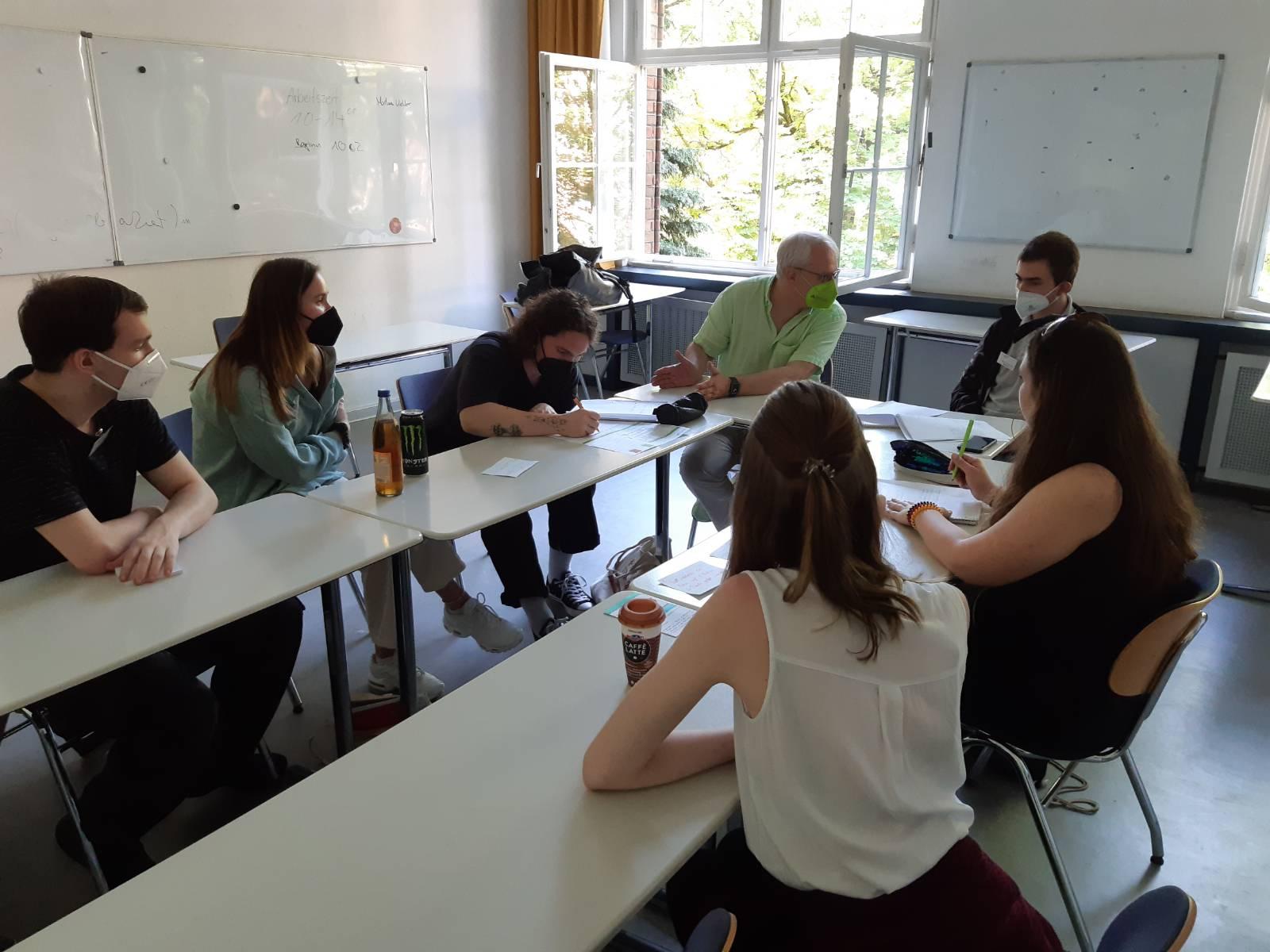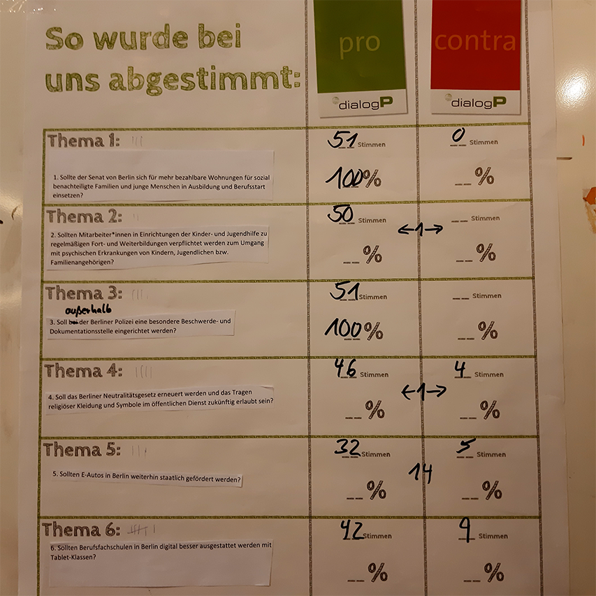 Unserer Schüler*innen saßen bei der Veranstaltung dialogP nicht zwei gefühlt ewig dauernde Stunden im Publikum und hörten dem Podium bestehend aus Politiker*innen zu, wie sie ihnen die Welt erklären. Vielmehr haben die Schüler*innen des Jahrgangs 2020 unserer Berufsfachschule selbst sechs Themen ausgehandelt, über die sie mit den Abgeordneten diskutieren wollten. An Thementischen debattierten insgesamt 54 Schüler*innen dann direkt mit den Abgeordneten. Vertreter* aller sechs Parteien des Berliner Abgeordnetenhauses rotierten hierbei von Thementisch zu Thementisch.