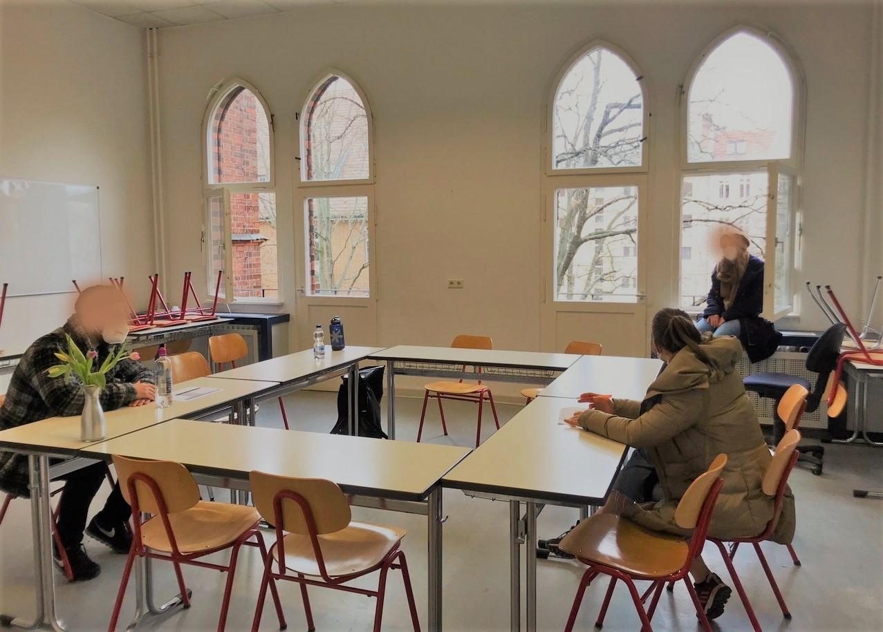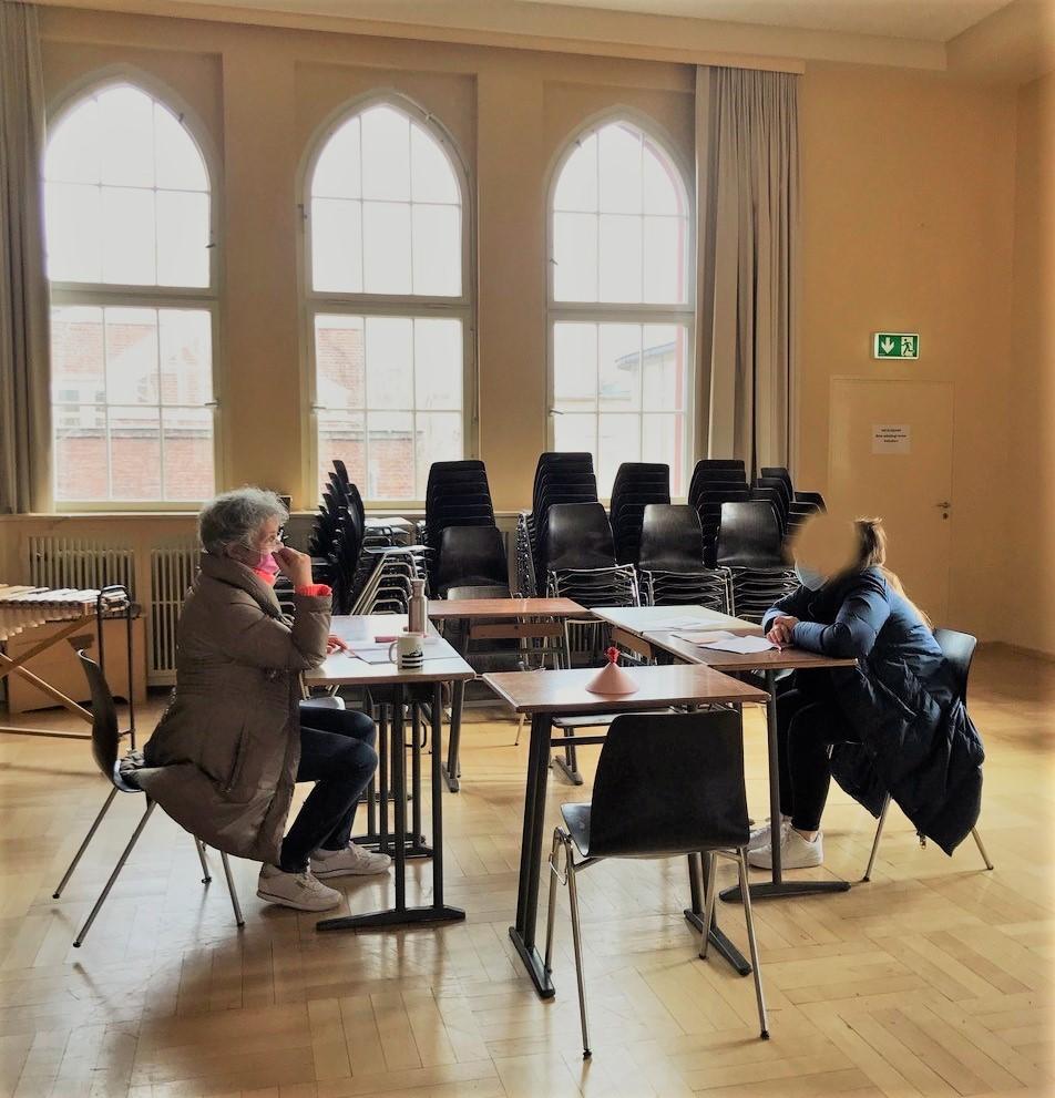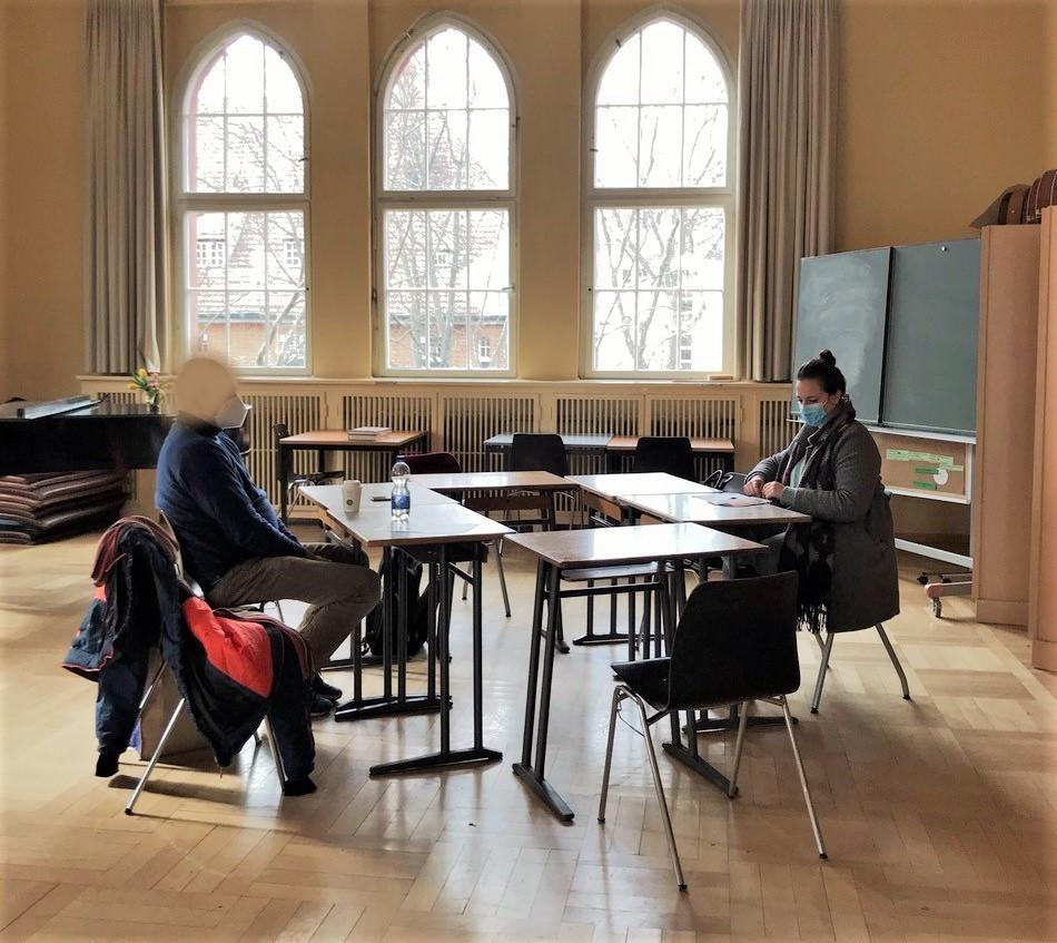 Interessierte des Tags der offenen Tür mussten sich dieses Jahr aufgrund von Corona-Bestimmungen anmelden und konnten so in einzelnen Beratungsgesprächen mit Studierenden und Lehrkräften die Bildungsgänge und unseren historischen Campus kennenlernen. Da uns weitaus mehr Anmeldungen als freie Beratungs-Slots erreichten, boten wir zusätzlich digitale Beratungsangebote in Videochats und Gruppenpräsentationen.