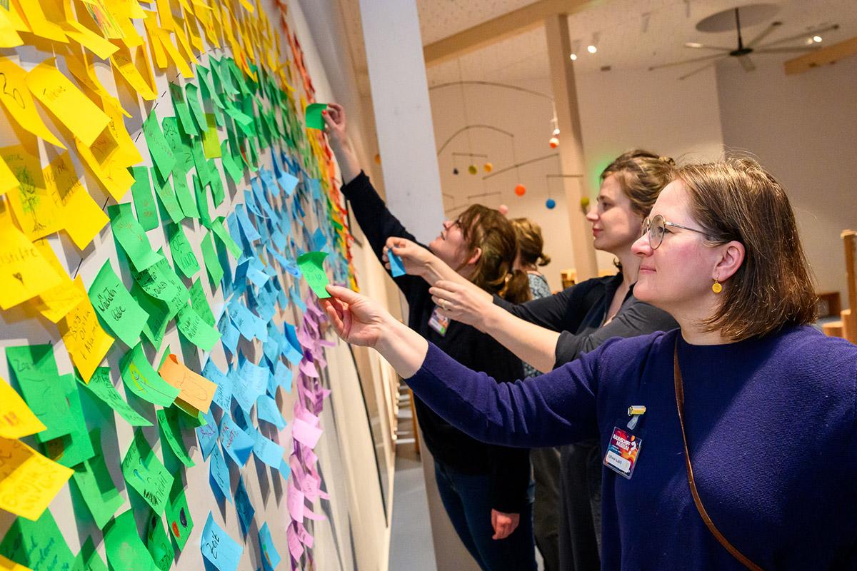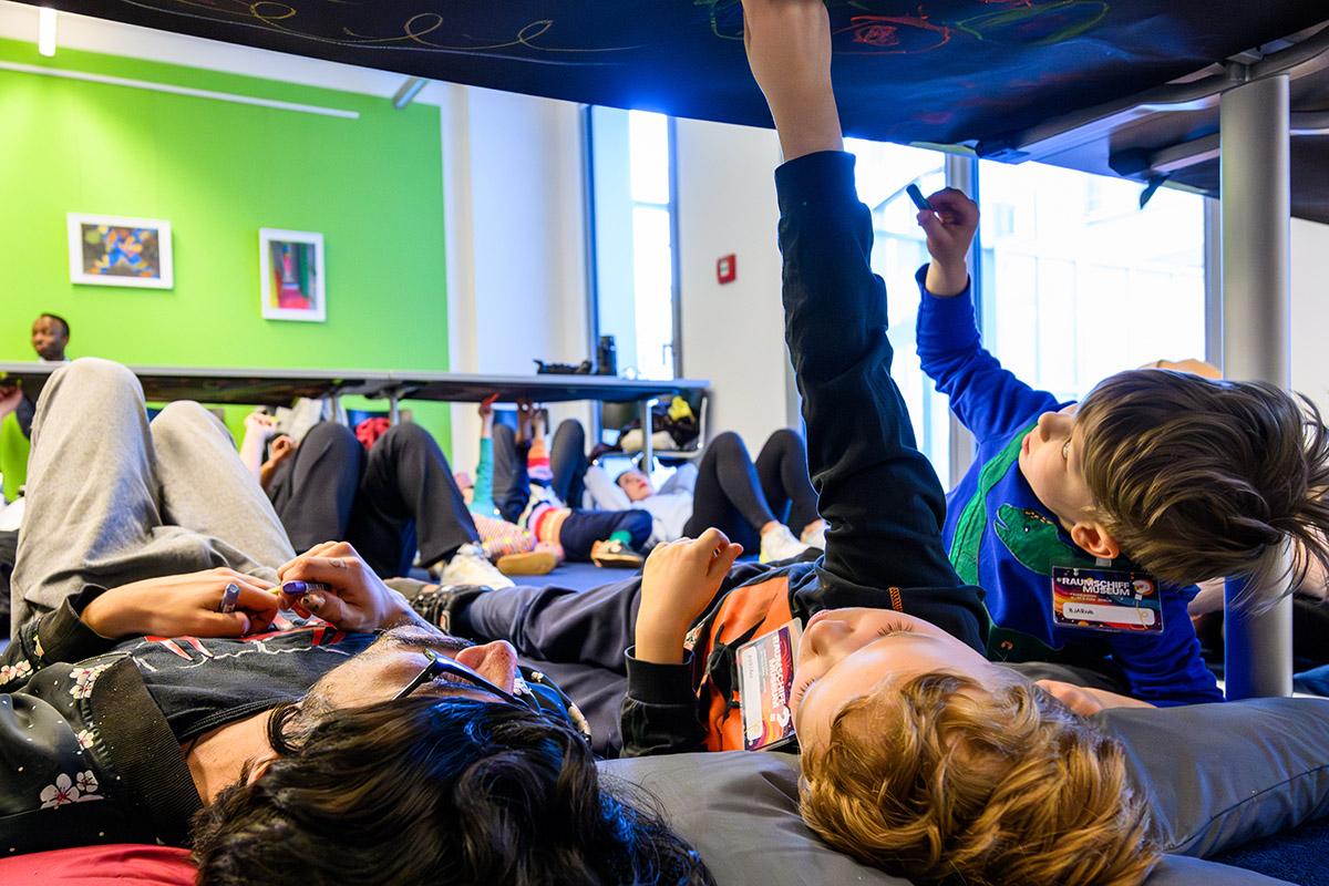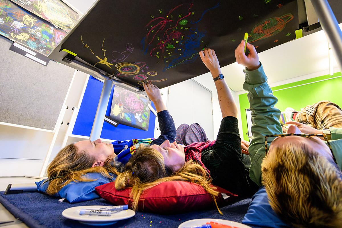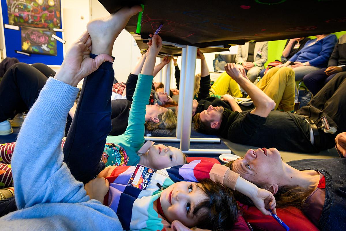 „Was ist deine erste Erinnerung an einen Museumsbesuch?“ war die Eingangsfrage an die Teilnehmenden der Fachtagung Raumschiff Museum? Frühkindliche kulturelle Bildung im Kontext von Museum und Kita, die am 11. und 12. März 2024 im ANOHA, der Kinderwelt des Jüdischen Museums Berlin, stattfand. Schon diese Frage ermöglichte den eingeladenen Gästen bestehend aus Erzieher*innen, pädagogischen Fachkräften, Museumsmitarbeitenden und Vermittler*innen den ersten Perspektivwechsel – ein sehr wichtiges Mittel, wenn es um die Diskussion von Fragen zur Teilhabe und Mitbestimmung der Allerjüngsten im Museum und in der Gesellschaft geht, denn diese sind bei Diskussionsrunden über ihre Bedürfnisse oft nicht anwesend. Der Perspektivwechsel ist einfacher getan als gedacht und führt so in die Praxis: In Workshops und Austauschformaten konnten die Teilnehmenden experimentieren, kneten, diskutieren und gemeinsam mit den Kindern aus der Kita Haubauchstraße über Kopf das Universum malen.