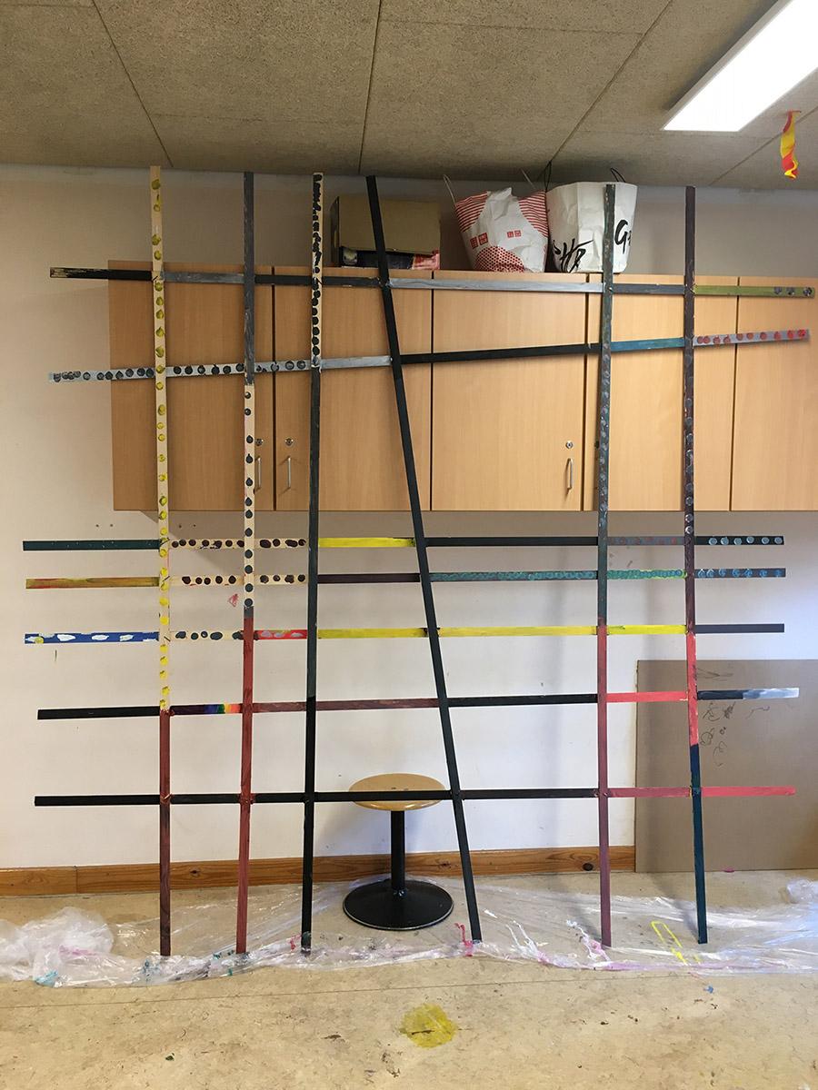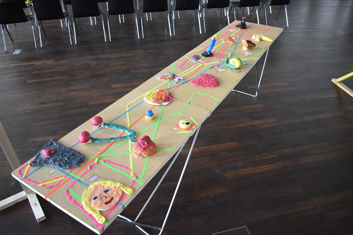 Durch das prozesshafte, kreative Zusammentragen von Nachfragen, Gedanken und Kommentaren mit Wörtern und Formen entstand ein Gerüst, das dazu einlädt, Worte zu finden für etwas, das kaum vorstellbar ist. Nach und nach erschufen die Kinder eine vielschichtige und durchlässige Konstruktion als ein gemeinsames Gedankengerüst.