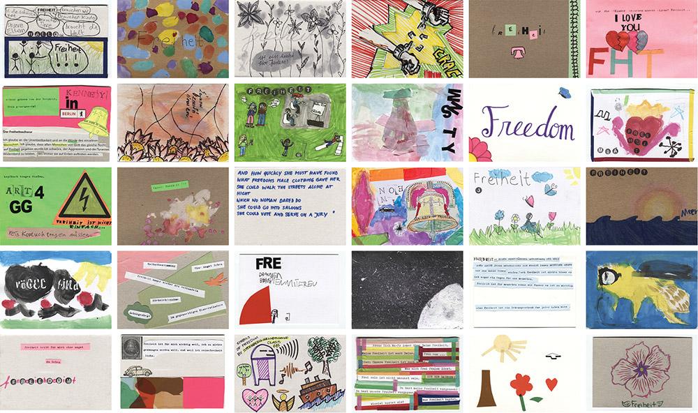 Die 6b der Sternberg-Grundschule hat ein „Neues Monument für die Freiheit“ erschaffen und die Freiheitsglocke als klingende Skulptur neu interpretiert (Kristen Cooper und Uli Westphal). Begleitet von einem Film (Peter Engelke), lud das „Gedankengerüst“ von Kindern der Ganztagsbetreuung der Stechlinsee-Grundschule zum Nachdenken über den Verlust von Freiheit ein (Dachil Sado). Die multimediale Installation von Kindern aus dem Ganztag der Sternberg-Grundschule gab unter dem Titel „Freiraum – Free is Our Space“ Einblicke in die Bedeutung von Freiräumen für Kinder (Irina Novarese und Antje Rieck). Die während der Aktion „Ich Du Wir“ auf dem Flohmarkt vor dem Rathaus gestalteten Postkarten warteten darauf versendet zu werden und an die Bedeutung von Freiheit zu erinnern (Viola Thiele und Silke Bauer). Die Malereien aus dem Workshop „Freedom on“ präsentierten sich als schwebende Mauern und stellten die Idee von Grenzen in Frage (Sarah Steiner). Interviews mit Besucher*innen des Nachbarschaftszentrums Steinmetzstraße gaben unter dem Titel „Imagine Freedom“ Einblicke in persönliche Vorstellungen von Freiheit (Philip Kojo Metz). Gestaltete Banner und Fahnen aus dem Workshop „Erzähl mir eine Geschichte zur Freiheit“ symbolisierten ausgetauschte Erinnerungen über persönliche Momente von Freiheit (Birgit Szepanski und Iris Wachsmuth). Wie „Die Stadt der Freiheit“ in Zukunft aussehen könnte, war in der Modell-Landschaft von Kindern aus der Ganztagsbetreuung der Sternberg-Grundschule zu entdecken (Ammar Hatem).