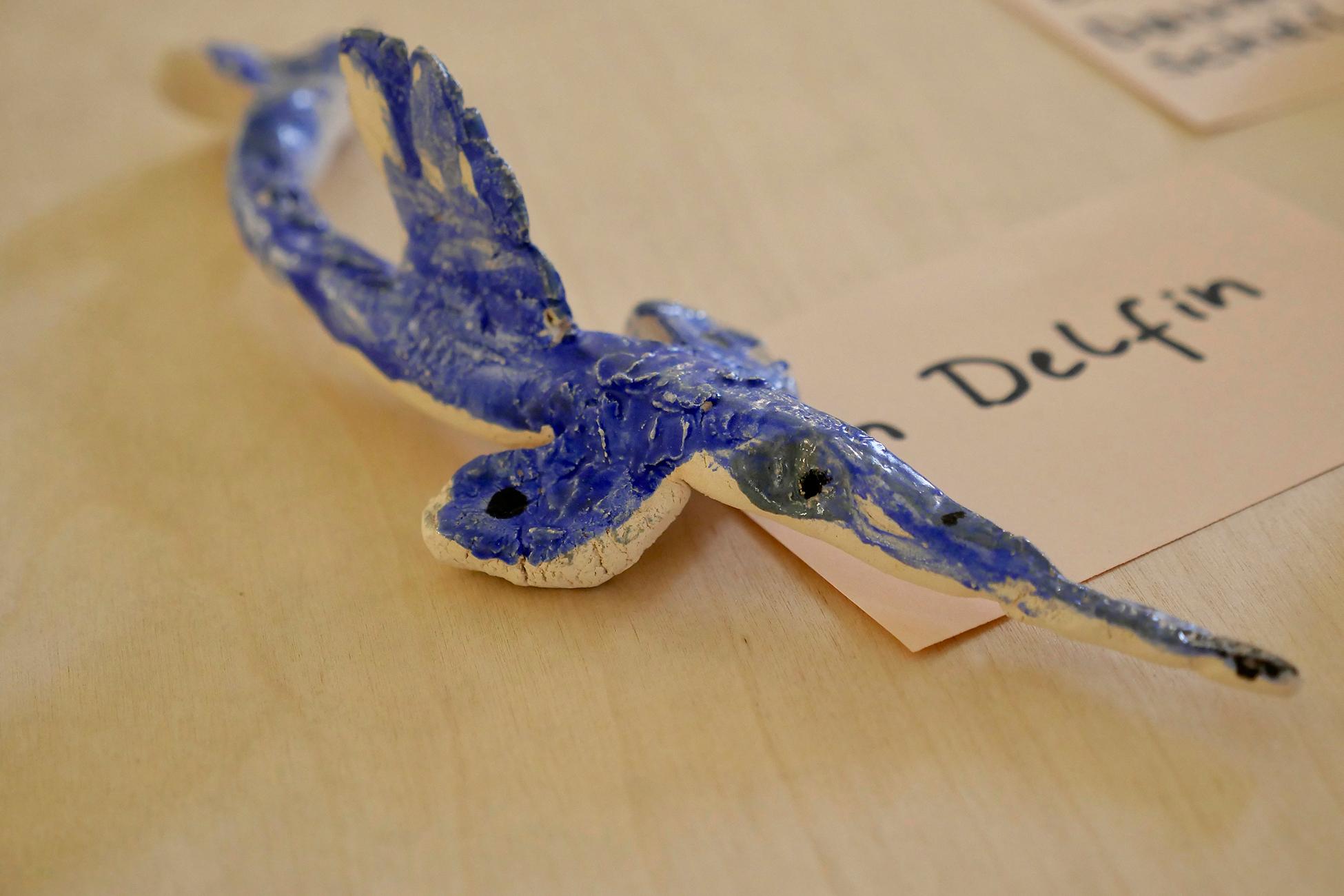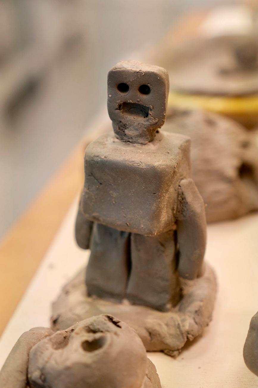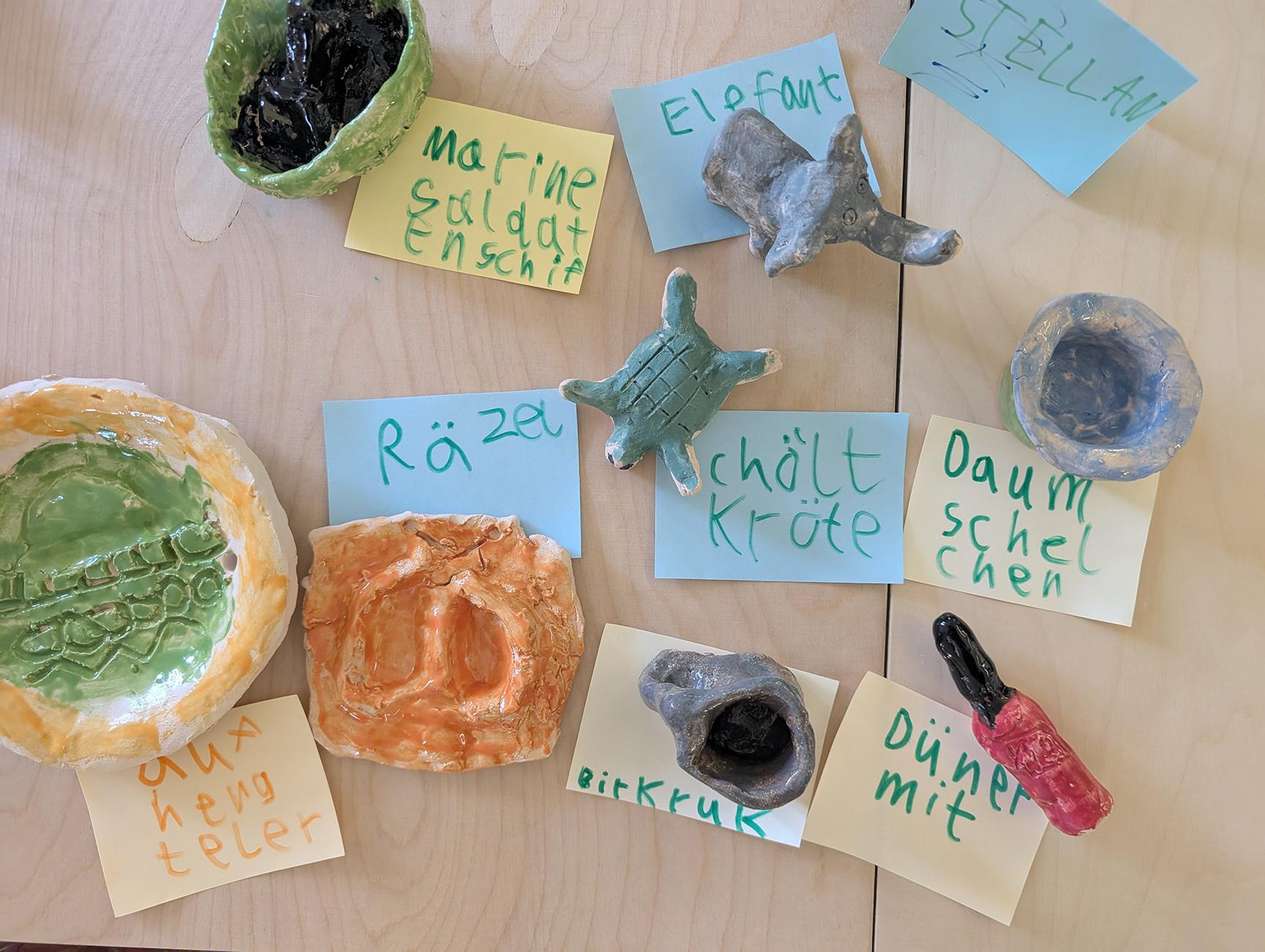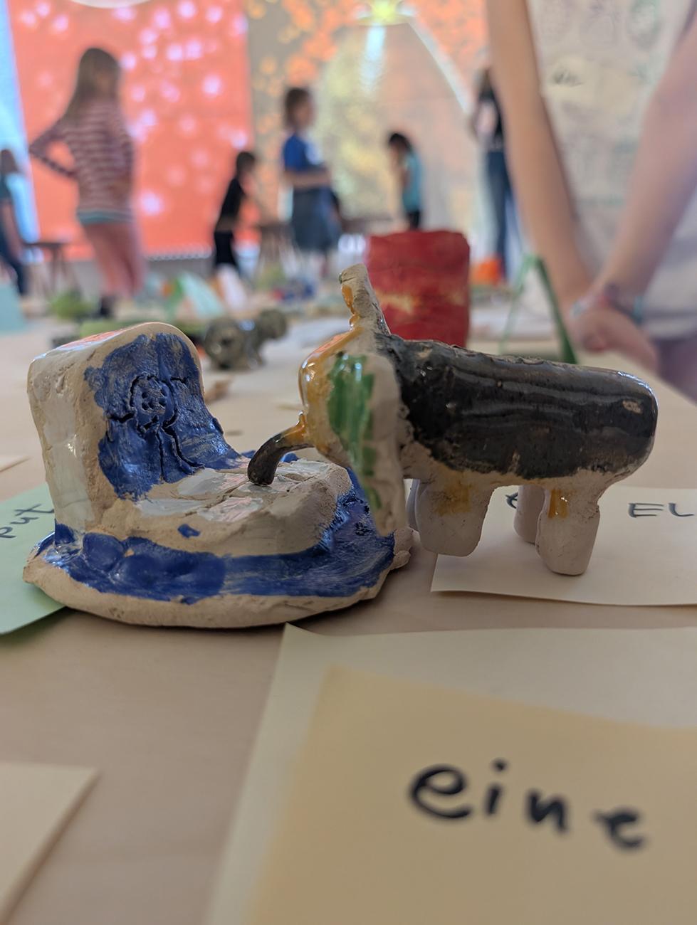 Die ausgestellten Gebrauchsgegenstände und menschlichen und tierischen Abbildungen und Figuren hatten Titel wie „Kleinkind“, „Das ist ein Herzrelikt“ „Schneckenversteck“, „Mein Schmetterling“ oder „Lichtschwert“. Die Kinder beschrieben den Besucher*innen während der Ausstellung den Entstehungsprozess und teilten dabei ihre einzigartigen Assoziationen und Geschichten.