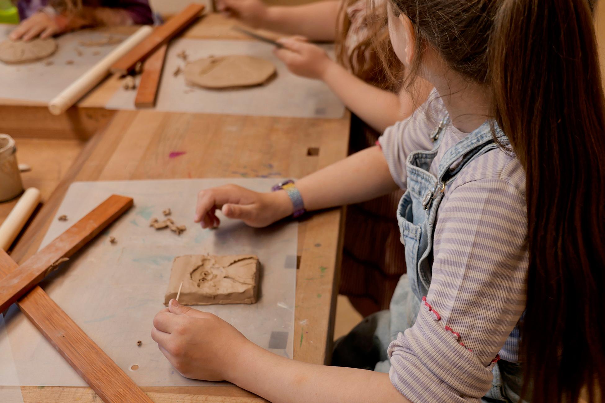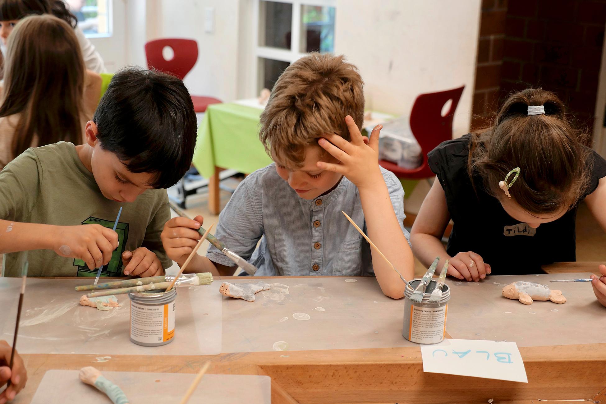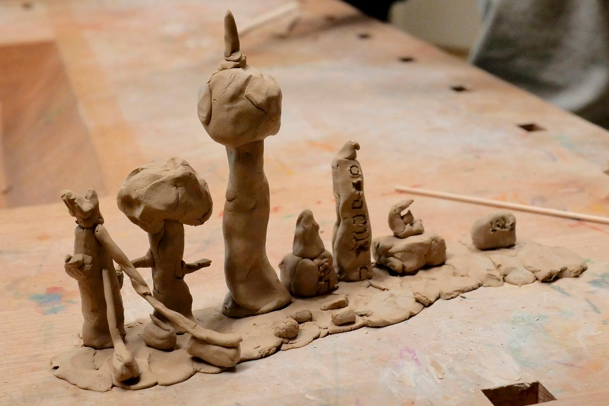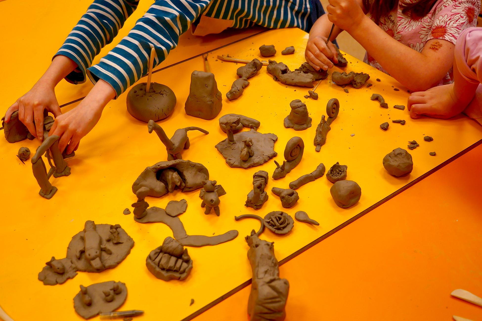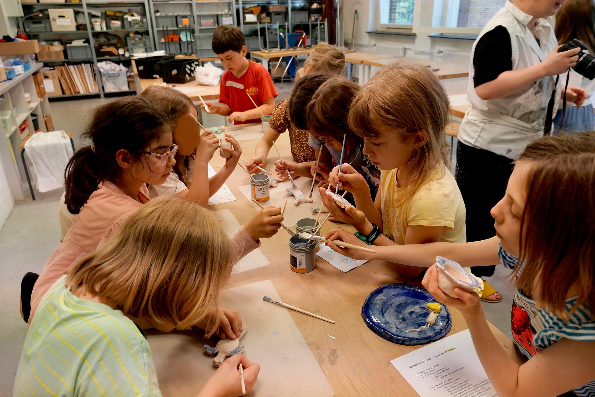 In den darauffolgenden Workshops übten sich die Kinder in unterschiedlichen Aufbautechniken, rollten, wellten aus, drückten und formten. Die entstandenen Objekte wurden gebrannt, dann glasiert und wieder gebrannt.