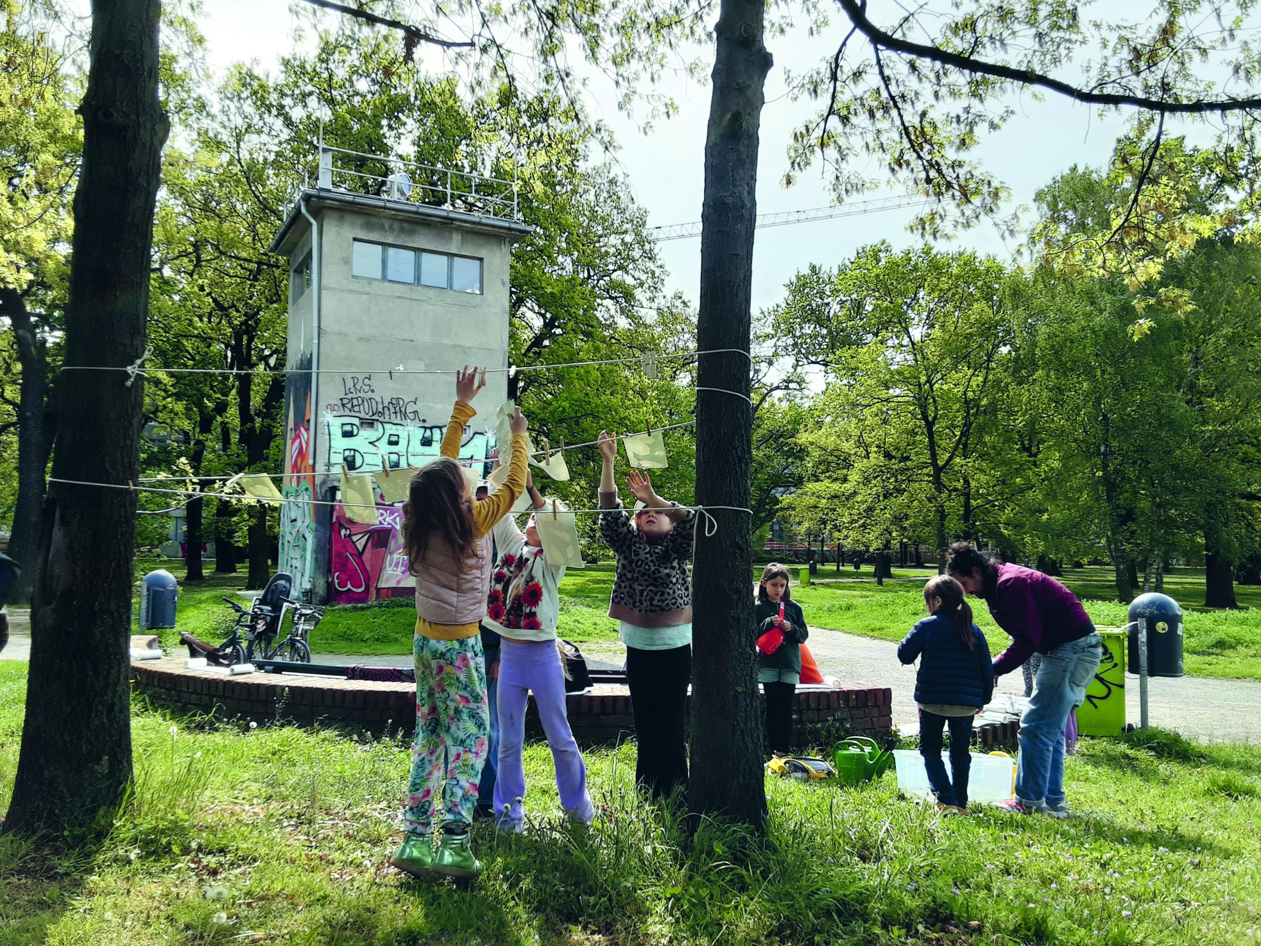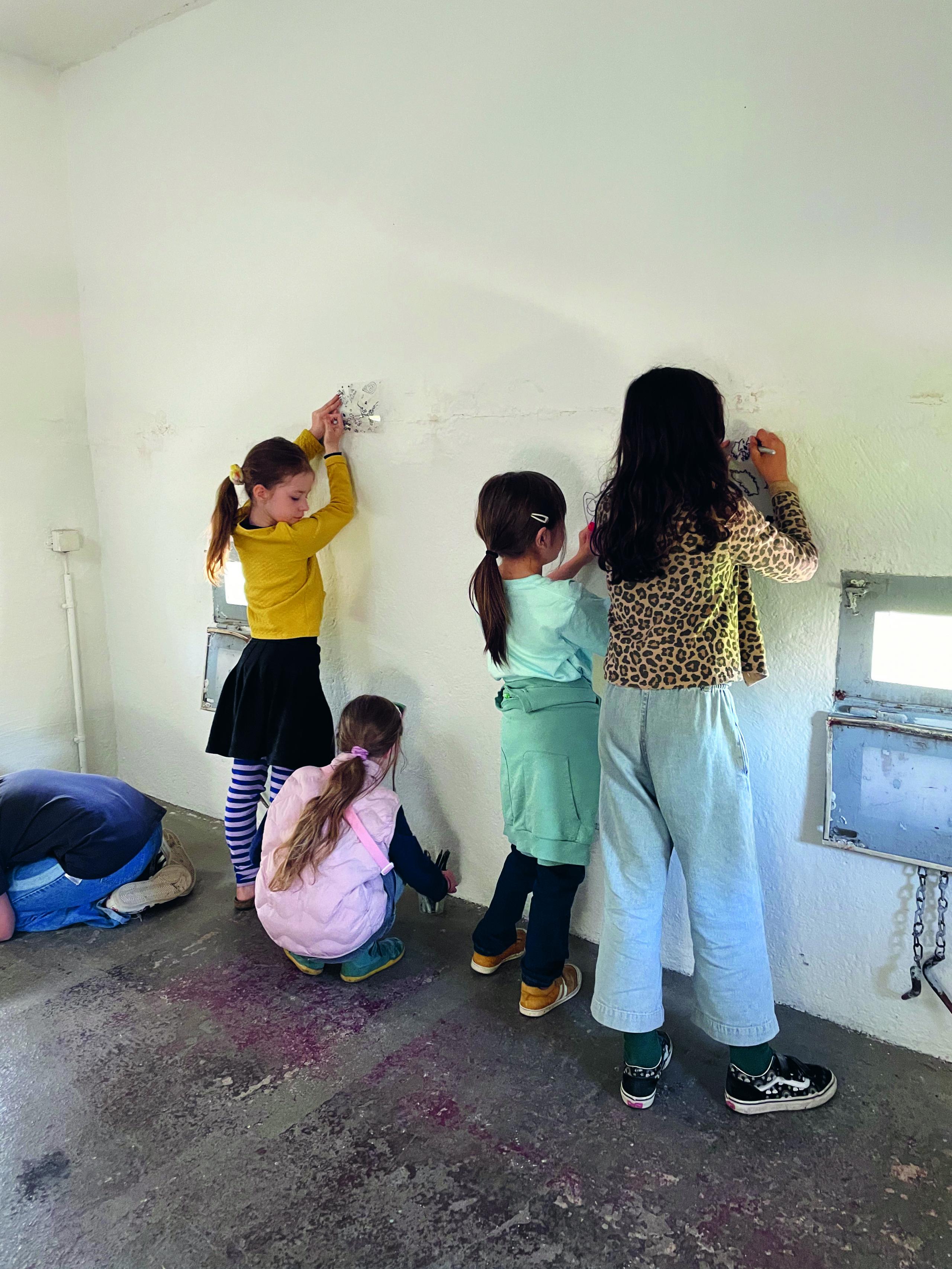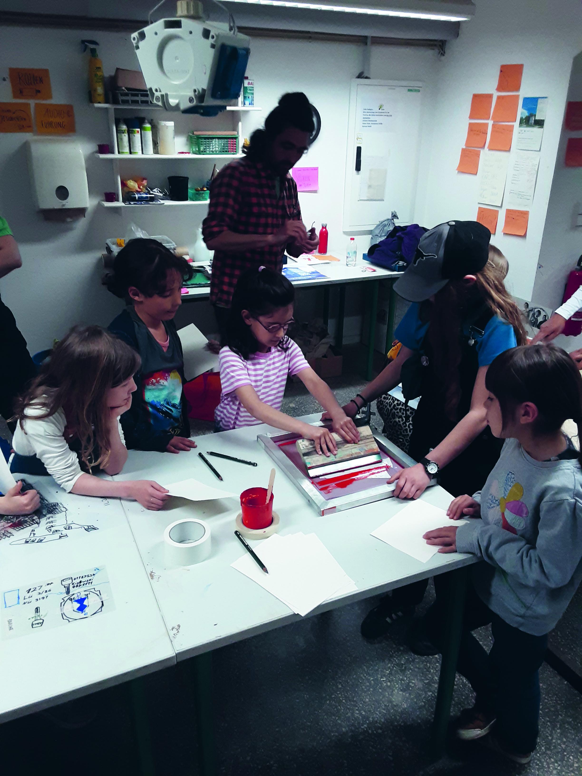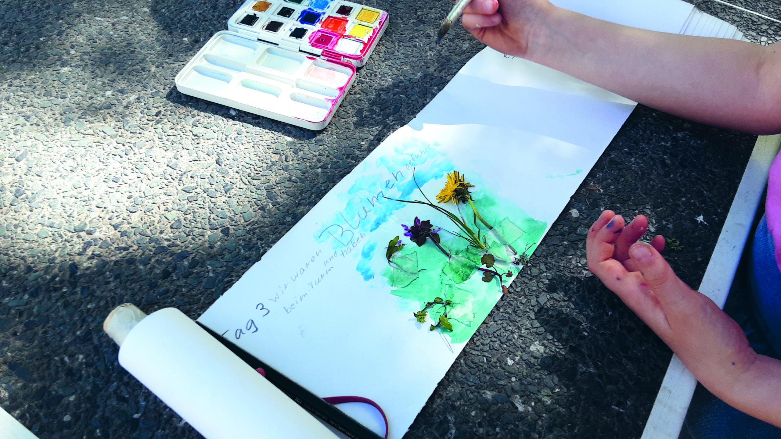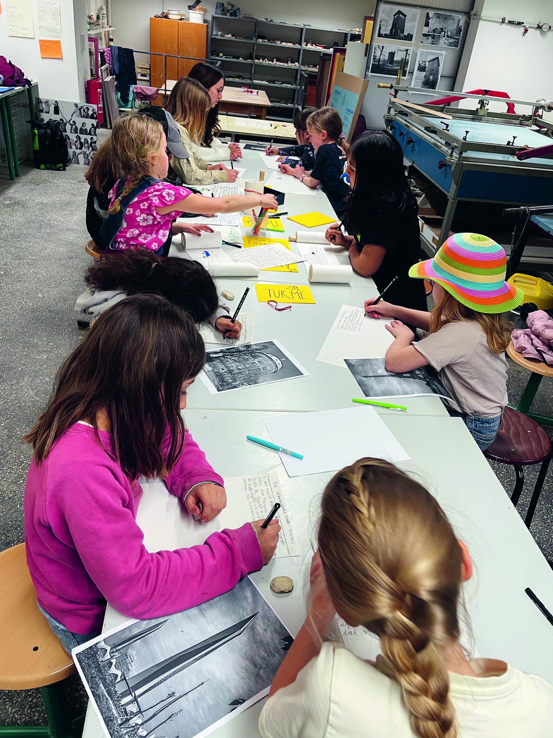 Kinder aus der Ganztagsbetreuung der Fichtelgebirge-Grundschule haben im Turm und rund um den Turm gesammelt, gezeichnet, gemalt und in der Duckwerkstatt der Fichtelgebirge-Grundschule eigene Motive gedruckt – begleitet von den Künstler*innen Irina Novarese und Diogo deCalle.