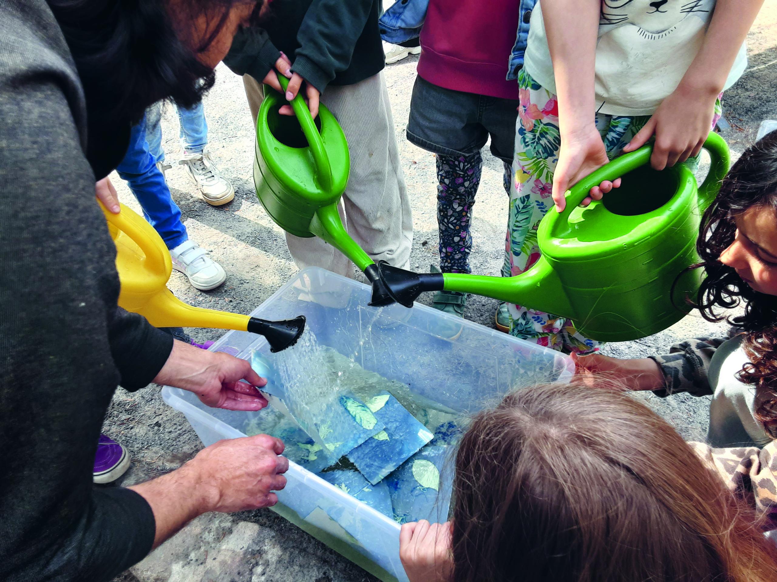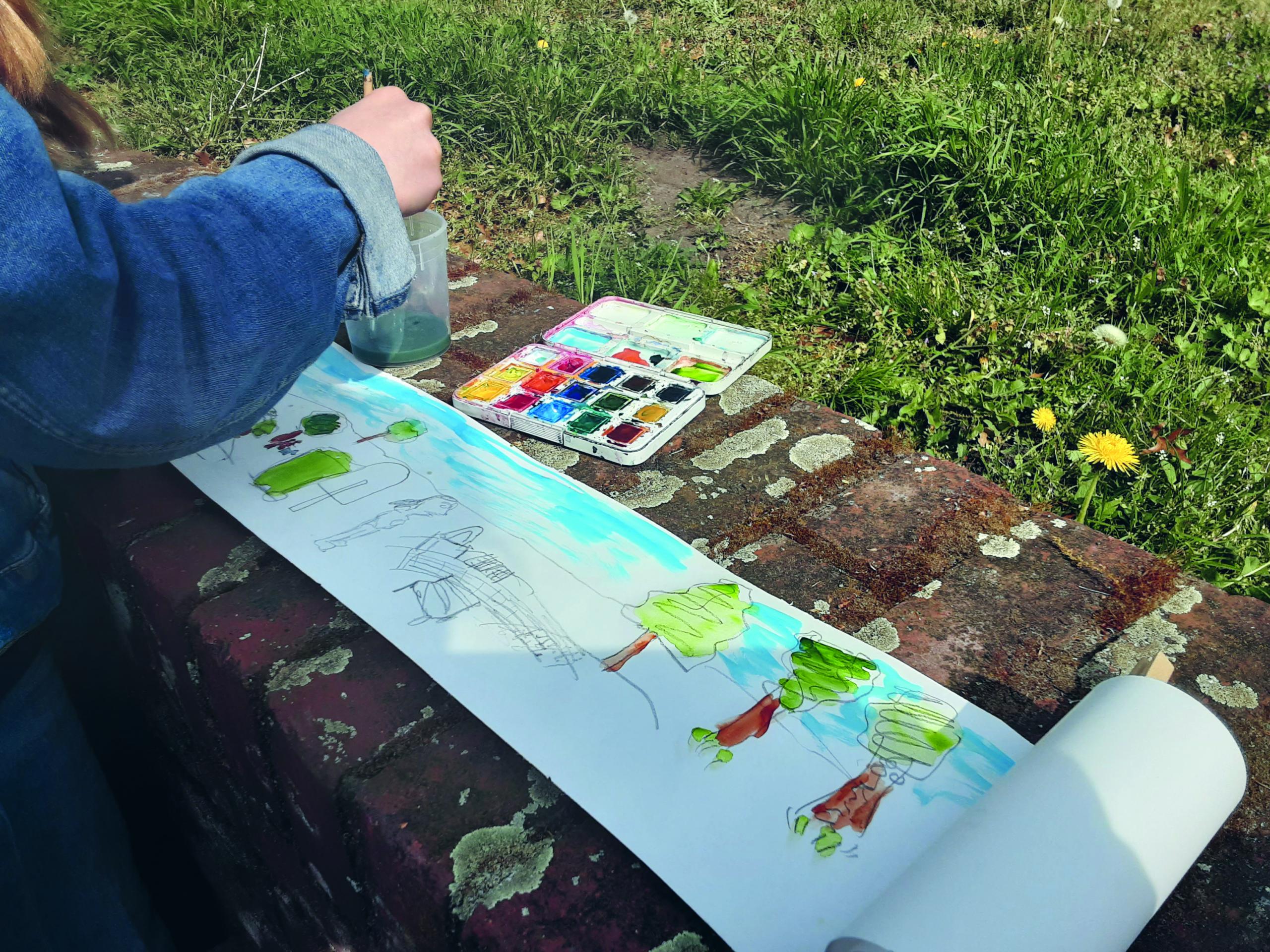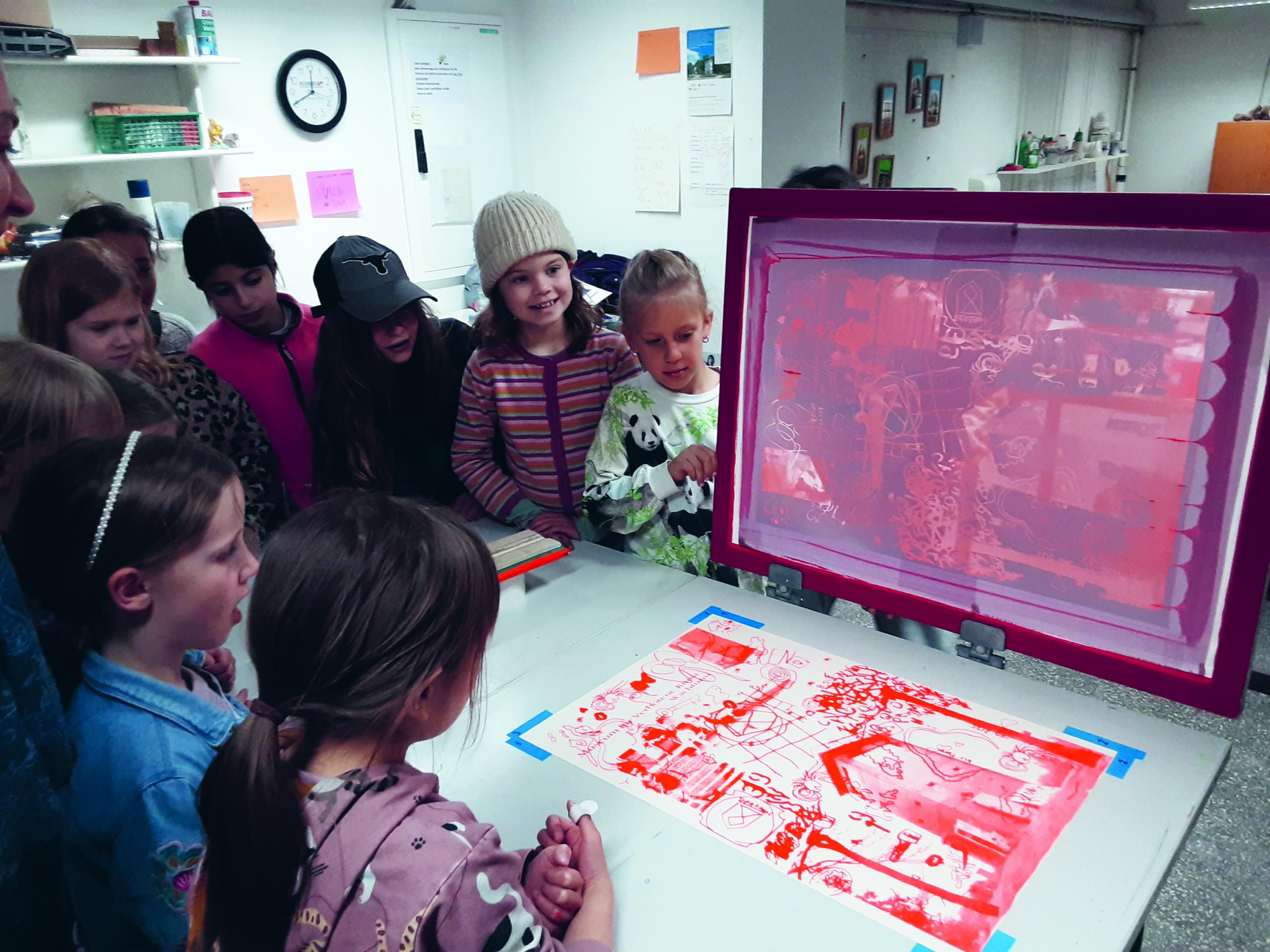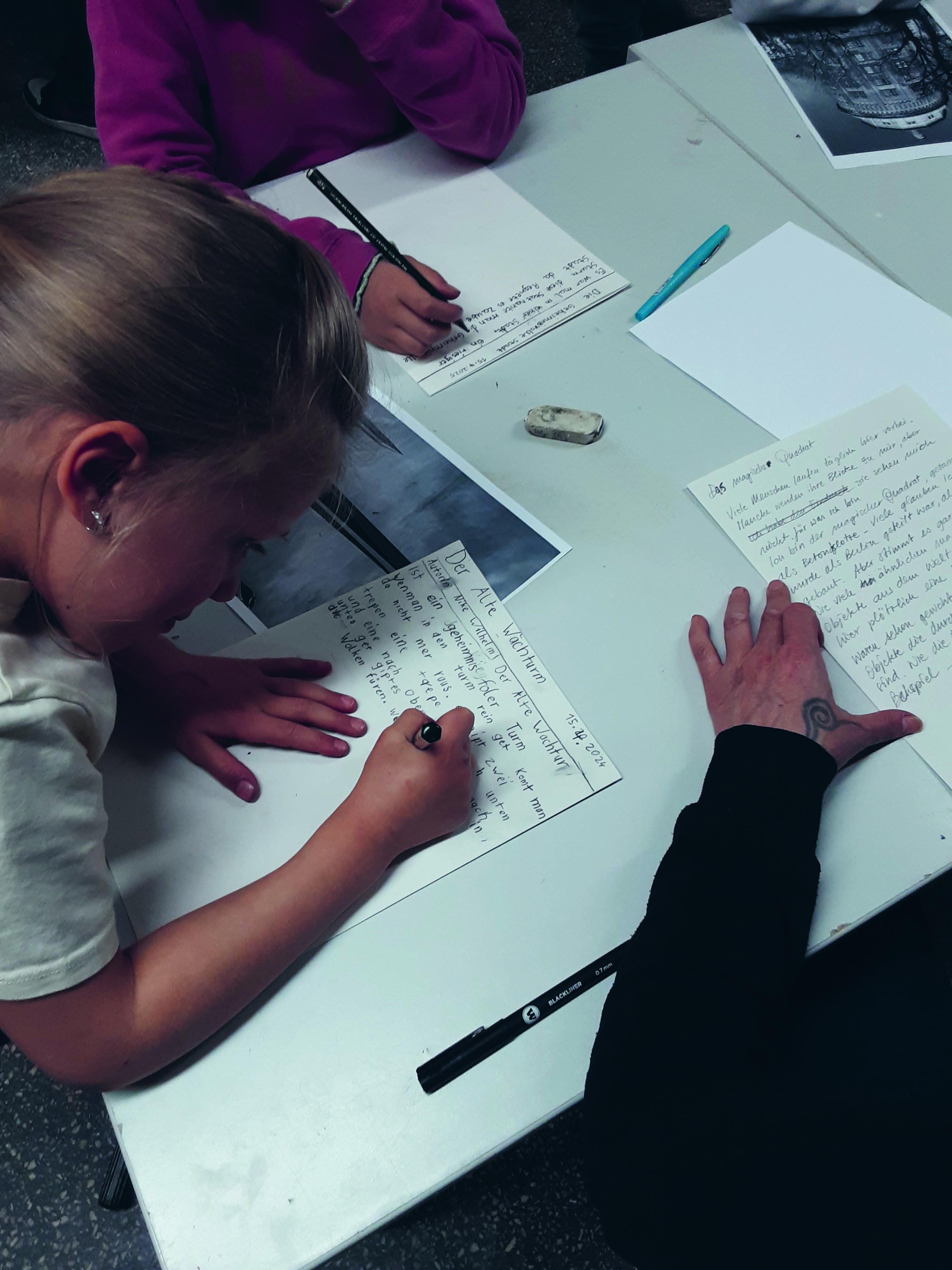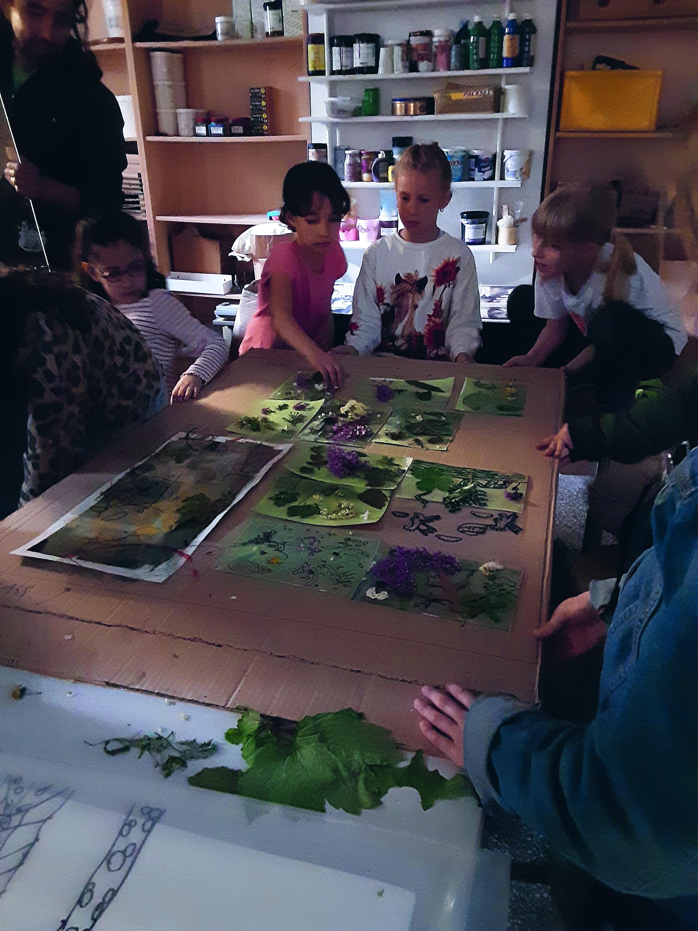 Kinder aus der Ganztagsbetreuung der Fichtelgebirge-Grundschule haben im Turm und rund um den Turm gesammelt, gezeichnet, gemalt und in der Duckwerkstatt der Fichtelgebirge-Grundschule eigene Motive gedruckt – begleitet von den Künstler*innen Irina Novarese und Diogo deCalle.