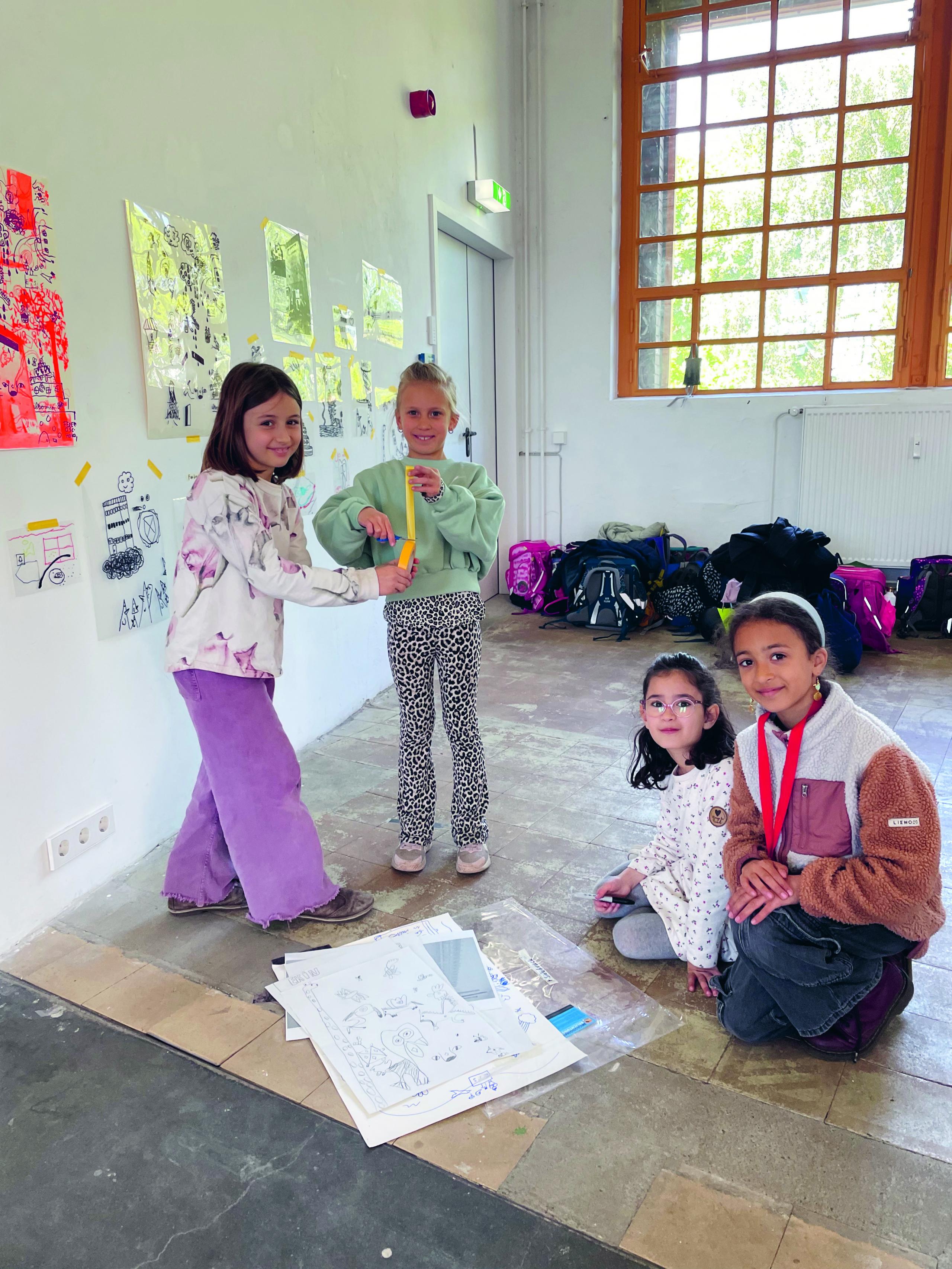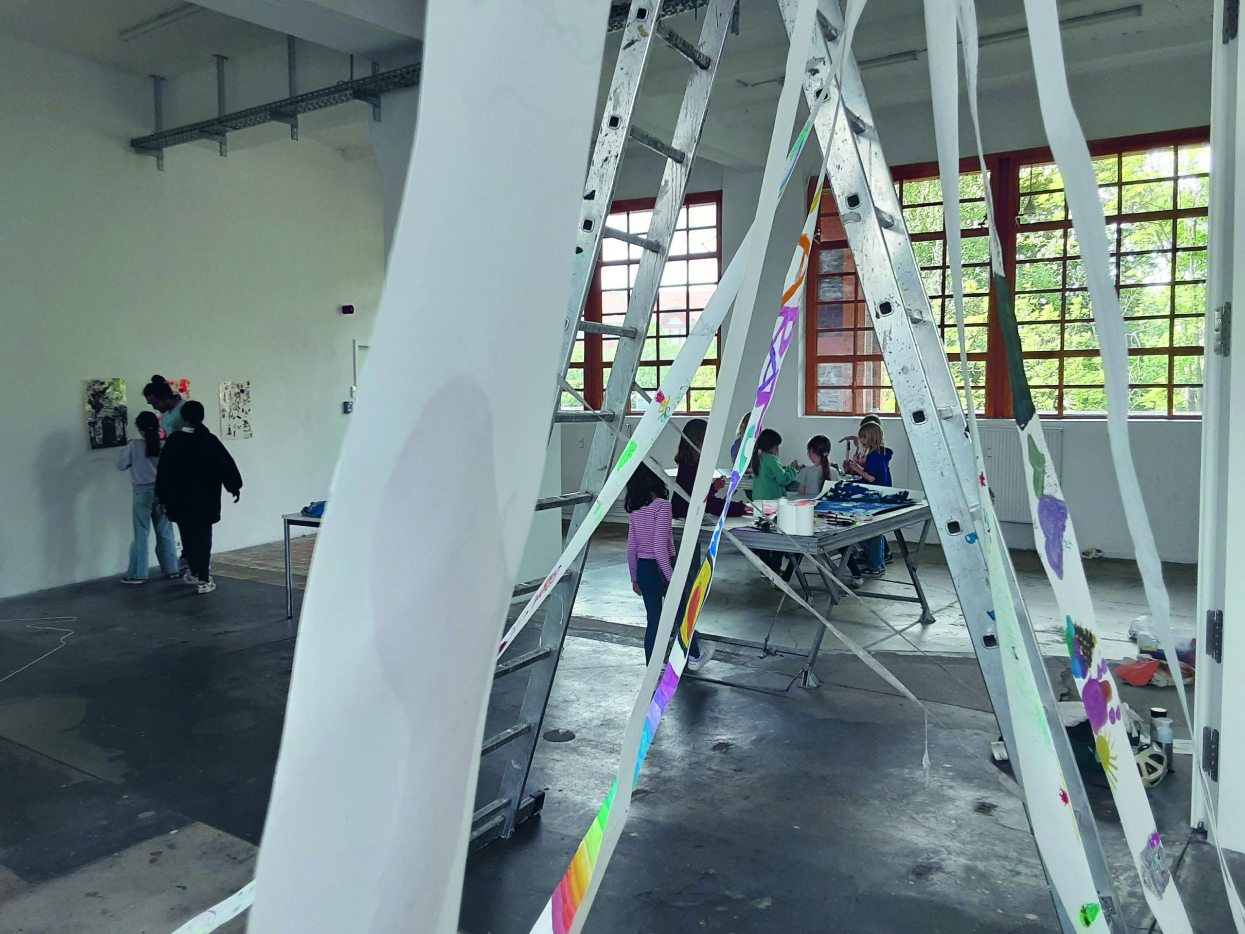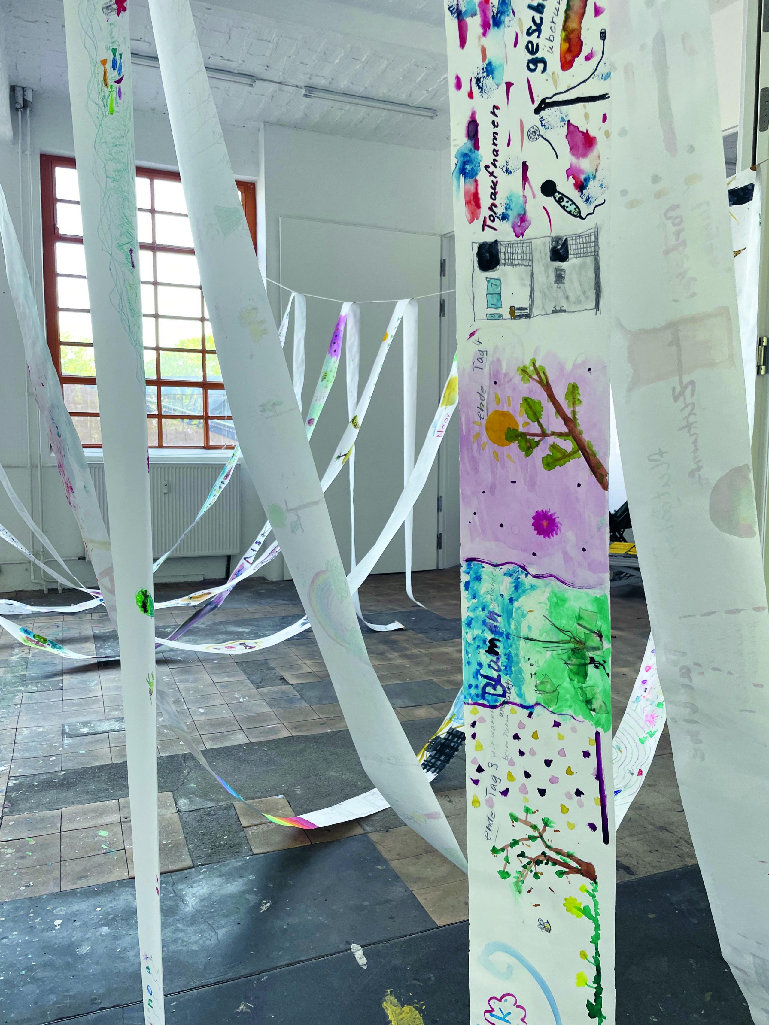 Bei der Abschlussausstellung am Dienstag, den 6. Mai 2025 im Atelierhaus Flutgraben in Berlin Kreuzberg präsentierten die Kinder die Fülle ihrer künstlerischen Arbeiten. Zu sehen waren die siebzehn Papier-Rollen, auf denen alle ihren zehntägigen künstlerischen Arbeitsprozess dokumentierten. In Form von Zeichnungen, Malerei und Text wurden den Betrachter*innen spannende Einblicke in ihre Gedankenwelt ermöglicht.