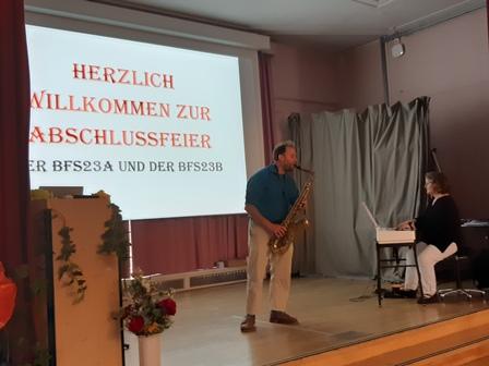 Der Schulchor sowie besondere musikalische Auftritte aus unserem Kollegium gaben ein Rahmenprogramm für Augen und Ohren, Herz und Seele. Der Schulleiter, Jochen Knopp, würdigte in seinen Ansprachen die Leistungen der Schüler*innen und Studierenden für ihren Abschluss, aber auch deren großes Engagement in der SV und/oder bei der Erarbeitung und Diskussion um unsere Vereinbarungen zum schulischen Miteinander, dem schulischen Kinderschutzkonzept, unserem Raumkonzept sowie der Gestaltung der Projekttage in diesem Jahr.