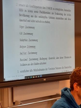 Am Ende wurde die Resolution dann zwar von der Mehrheit befürwortet, bei einigen Enthaltungen, aber die russische Delegation nutzte ihr Vetorecht und damit war diese Resolution blockiert. Das ergab im Anschluss eine längere Diskussion zum Sinn des Vetorechtes, zur Bedeutung und den Optionen des UN-Sicherheitsrates und zu den besonderen Herausforderungen bei politischen Verhandlungen für alle tragbare Lösungen zu formulieren.